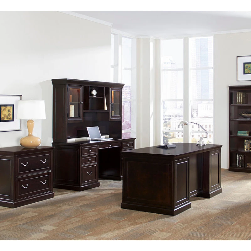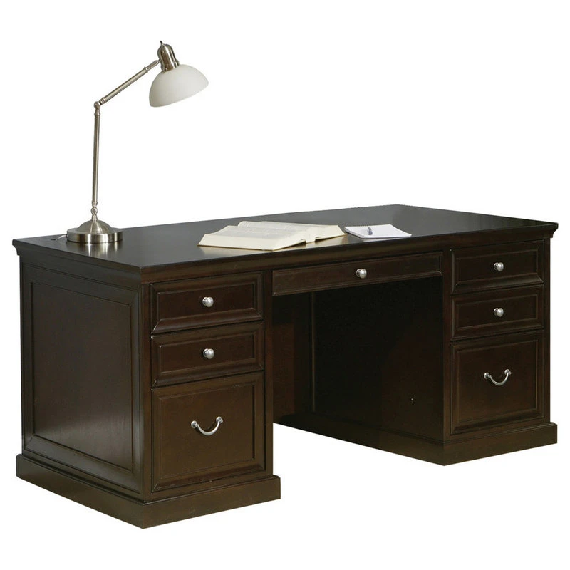 Crafted from solid wood, this timeless desk boasts a classic double pedestal design, equipped with four utility drawers with removable dividers, a keyboard drawer suitable for laptop use, and two file drawers. An updated interpretation of a familiar style, this piece combines traditional elements, such as crown molding and picture frame detailing with contemporary influences, such as crisp lines, satin nickel hardware and a rich, multi-step, hand-applied espresso finish. With its rich brown tones and uncomplicated silhouette, Fulton Double Pedestal Executive Desk brings a warm, unpretentious touch to any home or office space.