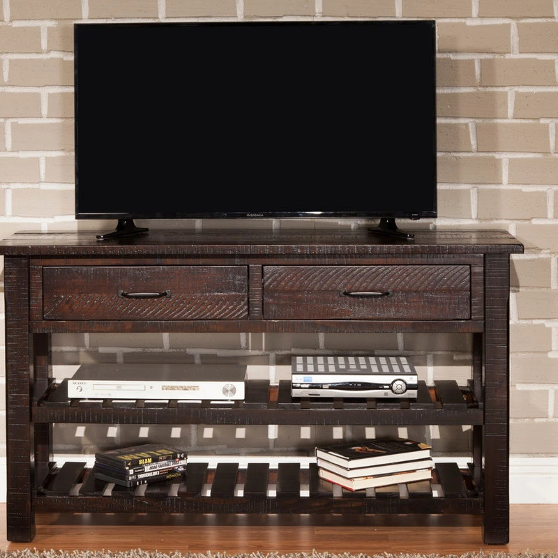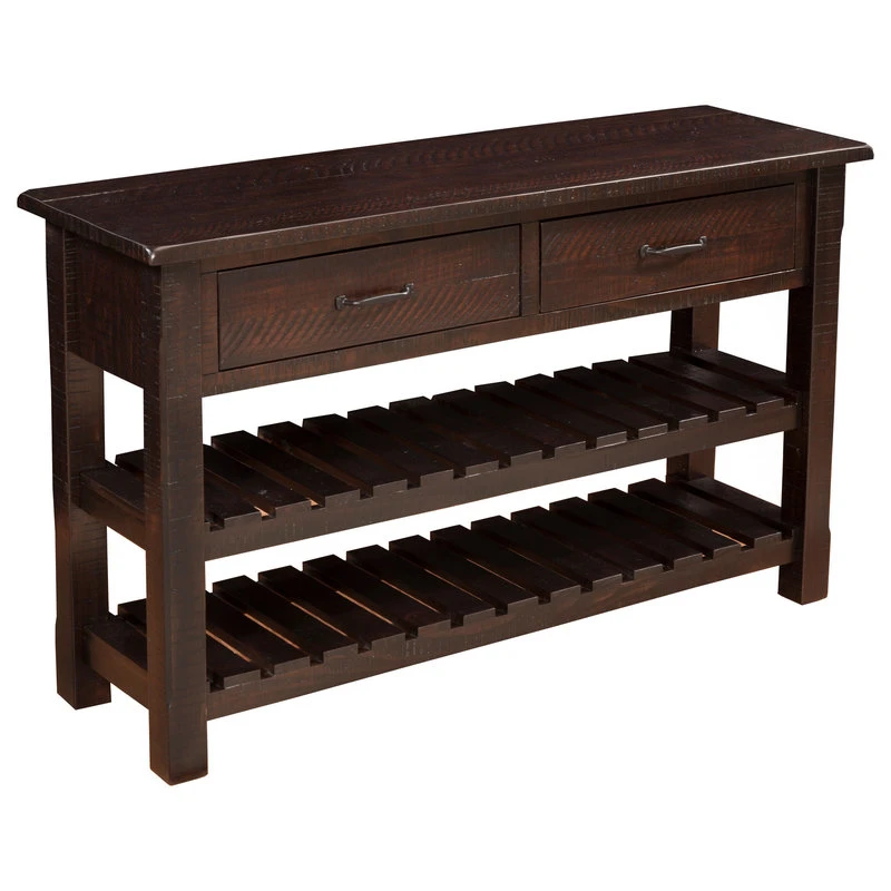The Barn Door Collection Console Table is a beautiful casual farmhouse/cottage styled table with a hint of a rustic touch. This console table is finished in an Espresso finish and constructed of solid New Zealand Radiata Pine with rough-hewn saw marks. Additional details include soft rounded corners on the top while the legs are beautifully detailed with chamfer cuts. Table has two drawers with ball bearing slides and custom finished drawer handles. The two (2) slatted bottom shelves further complement the tables farmhouse look while offering extra storage space. An additional design feature allows for up 12 standard 750 ml wine bottles to be safely stored between the slats on the bottom two shelves. The versatile design and look allow for the console table to be used in the living as a TV stand for TVs up to 55″ or in the dining room as a server or buffet.