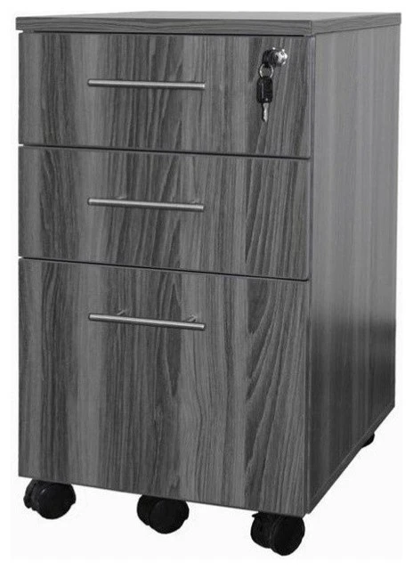 Pedestal is part of the Mayline Medina Series with contemporary style and elegant functionality. Clean lines, curved shapes and floating worksurfaces reflect Italian design influences. Gray Steel laminate finish ensures a beautiful collaboration with other Mayline furniture and complements most any decor. Laminate is stain-resistant, water-resistant and abrasion-resistant. Both box drawers and the file drawer operate smoothly using full-extension, ball-bearing suspensions. File drawer accommodates both letter-size and legal-size file folders with included hangrails. Durable pedestal fits under credenzas and rolls smoothly on 2 dual-hooded casters. Ganglock features a removable core for locking all three drawers. Finished top surface offers another surface for storage when you situate the pedestal next to your desk.