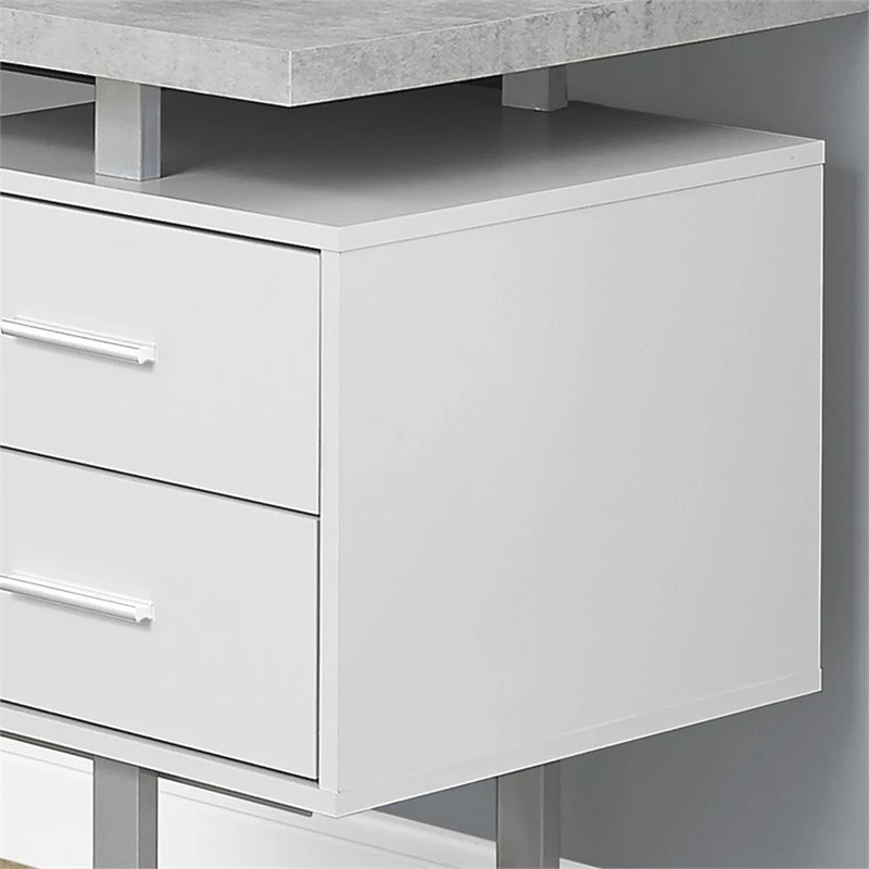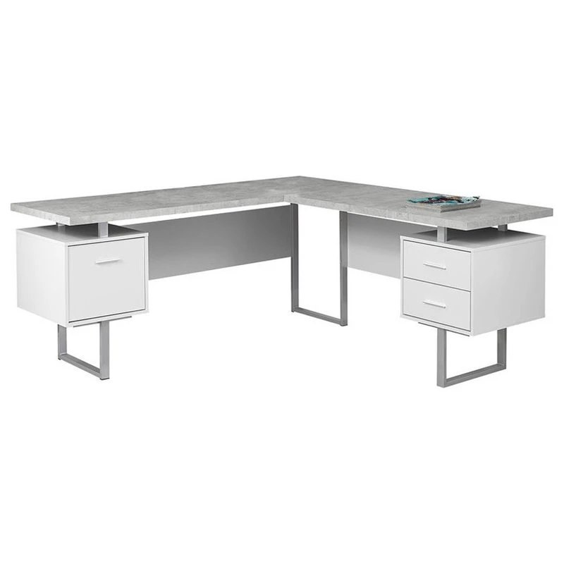Give your home office a promotion with this extra-large, corner desk. The L-shaped, floating desktop in a grey cement-look finish is generously sized and leaves space to use the tops of the white drawer units as shelves. A reversible configuration lets you set up the desk with the drawer units on either side as desired. The space between the 3 storage drawers allows ample room to easily move around your workspace. Providing support are 3 robust metal legs in a silver finish that matches the drawer handles. This L-shaped computer desk saves space when used in a corner but is finished on all sides for a polished look wherever it is placed in a home office.