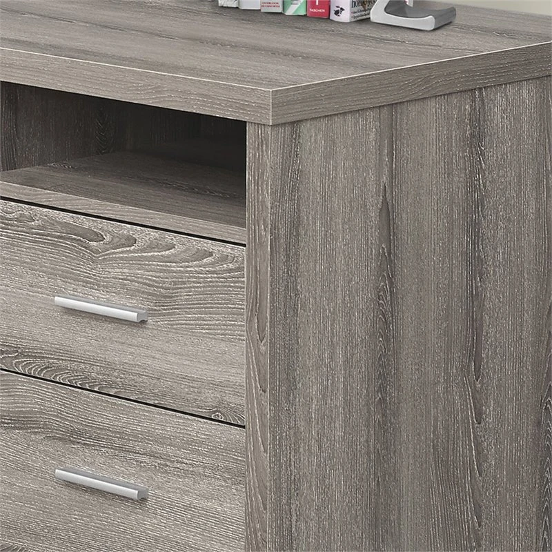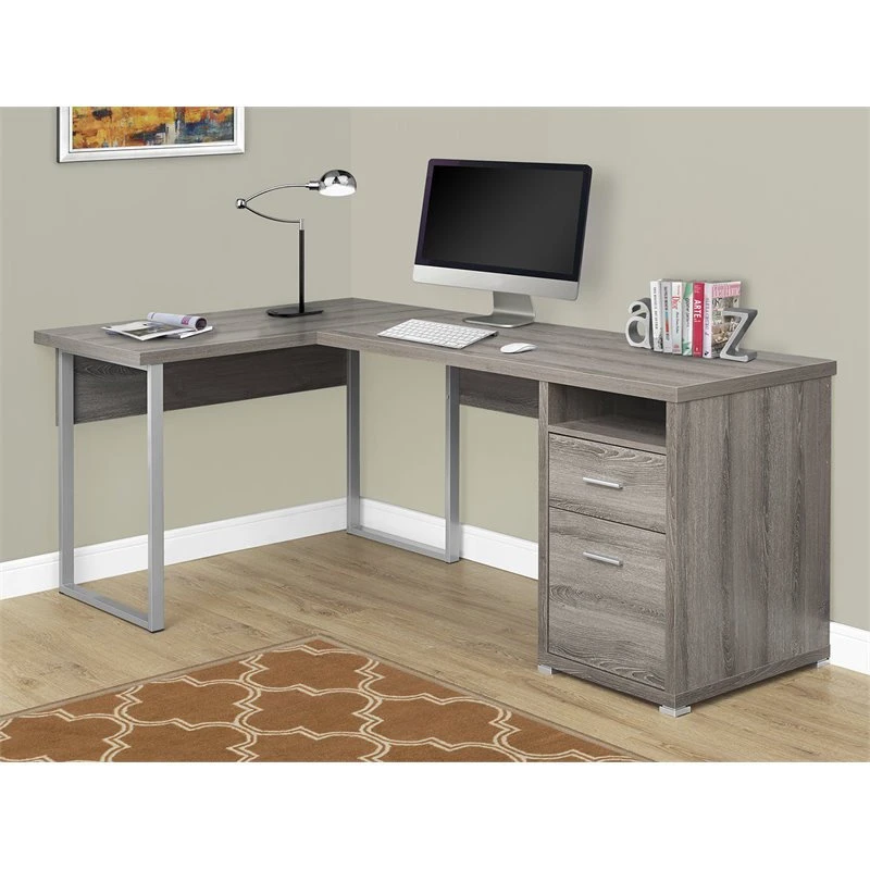 “L” stands for more than just the shape of this computer desk. It stands for “lots” of convenience and room to work. This corner desk in a dark taupe wood-look finish has a reversible configuration so you can set up the side with the storage unit on the left or right according to your preference. The 1 cubby and 2 storage drawers (including 1 for letter- or legal-size hanging files) help to keep the desktop clutter free. Providing support for the spacious desktop are 2 robust, rectangular metal legs in a contrasting silver finish. This L-shaped computer desk saves space when used in a corner but is finished on all sides for a polished look wherever it is placed in a home office.