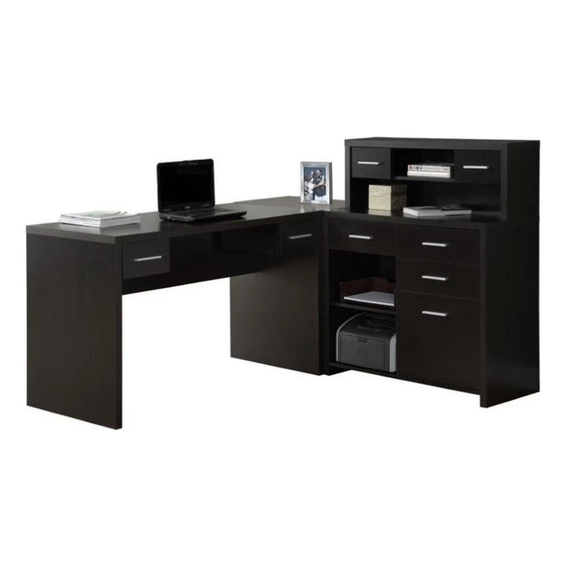 Create a professional looking workspace when you outfit your home office with this L-shaped corner desk. Finished in a rich cappuccino color, this structured, modern L-shaped desk creates ample storage space and provides a broad work surface in your home office. This stylish and functional executive desk contains a wide variety of drawers and cabinets for multiple uses, allowing you to keep your work surface clean and uncluttered.