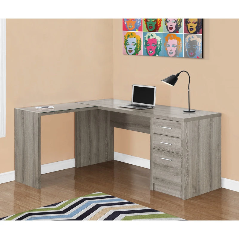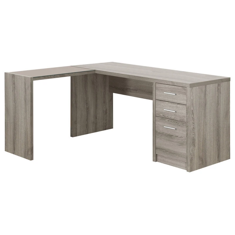 This corner computer desk in a dark taupe wood-look finish with a partial tempered-glass desktop provides a generous surface where you can reflect on your work. The large, L-shaped desktop features a tempered-glass inset on the left that protects the laminated surface underneath and reflects the surroundings to bring a touch of shine to your work area. On the right is a filing cabinet with 3 storage drawers in 2 sizes, including 1 for letter- or legal-size hanging files, all with silver handles and metal drawer glides. This L-shaped computer desk saves space when used in a corner but is finished on all sides for a polished look wherever it is placed in a home office.