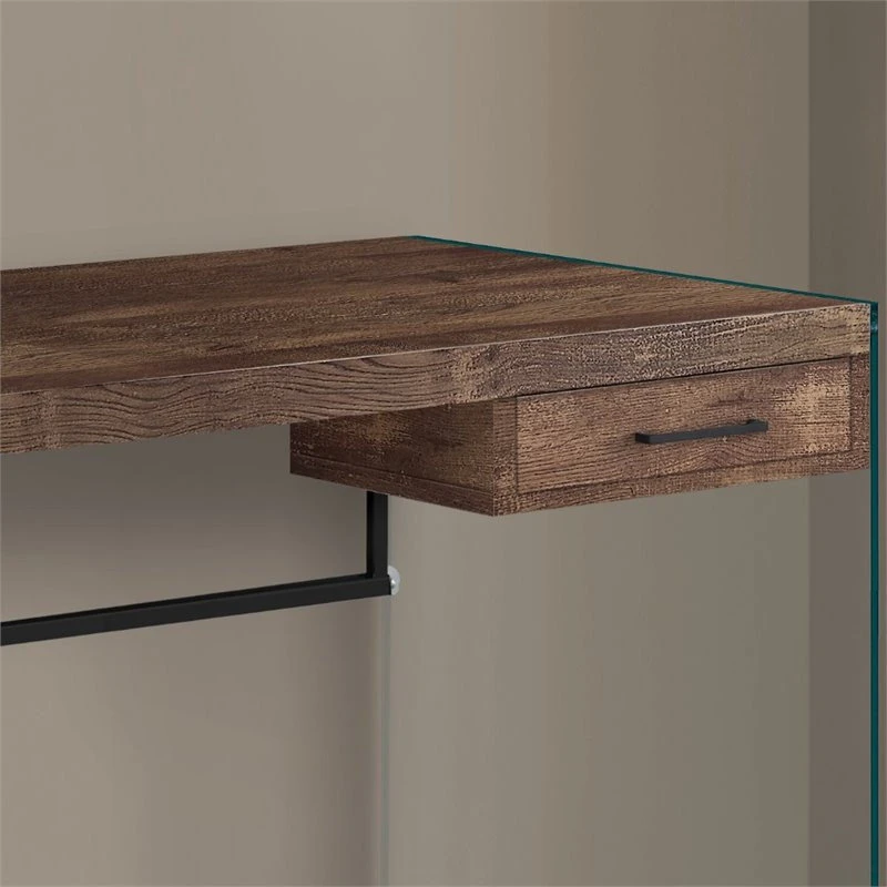 Unphased by small homes, apartments or condos with limited space, this simplistic office desk is compact enough; yet it has ample surface space for any laptop computer, a lamp and your books/documents – A recipe for success! Enjoy its thick panel reclaimed wood look surface in brown, finished on all sides, in addition to the clear tempered glass legs that are great in tight work spaces. For your convenience, the desk features a storage drawer for any other supplies you prefer to stow away while not in use. When you need to refresh your work area at home or at the office, you’ve come to the right place.