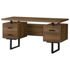 - Computer desk with 3 storage drawers and a large, thick-panel floating desktop in a walnut wood-look finish