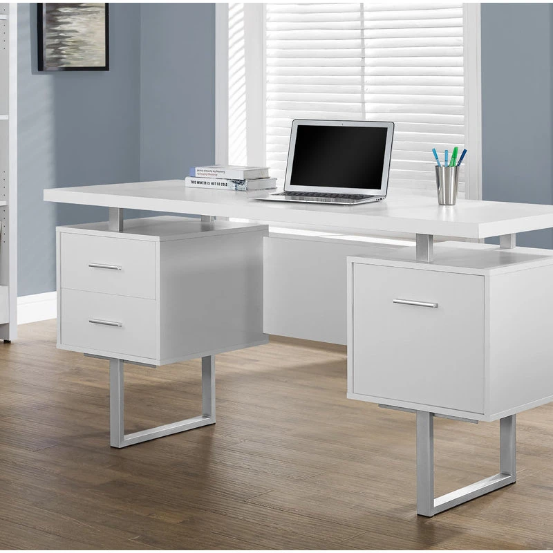 Feel like a boss in your home office when you sit down to work at this mid-size computer desk with 3 storage drawers. The thick-panel floating desktop provides generous room for a laptop and writing materials, and allows you to use the tops of the drawer units as extra surfaces. Finished in the same white laminate as the desktop, 2 small drawers and 1 large drawer with a bar for hanging files offer space for items you want to keep off the work surface. For flexibility, the drawer units are reversible and can be installed on either side according to your preference. Supporting the desk are metal legs in a silver finish with a modern, stylish U shape.