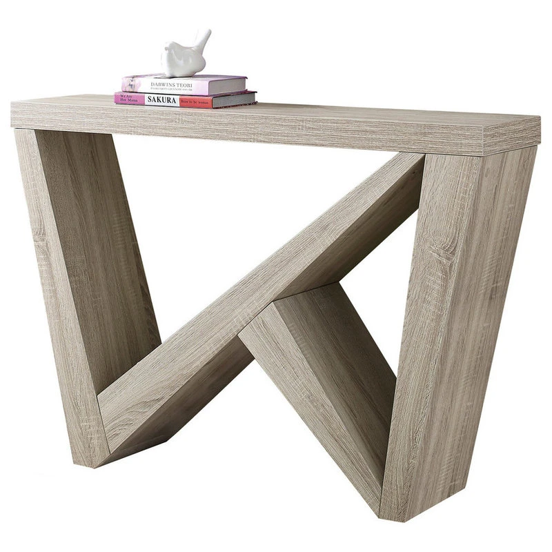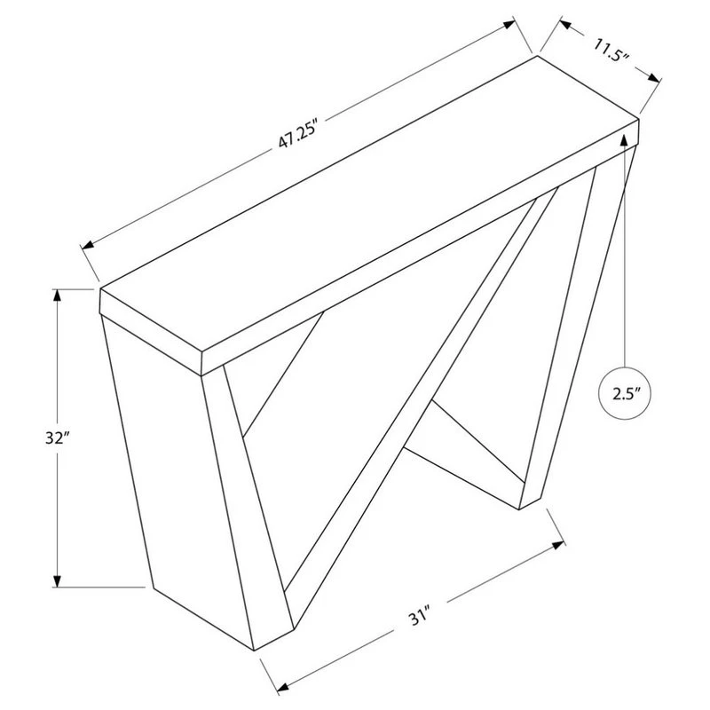 The Dark Accent Table is a contemporary product with a modern edge. Constructed with a thick panel edge and asymmetrical lines, this table will be quick to make a statement in your living space. Perfect for displaying photos or surface decor, the Dark Accent Table showcases your personality.Assembly Required: YesColor: TaupeMaterials: MDF, Particle Board, LaminateDimensions: W 47″ x D 11″ x H 32″