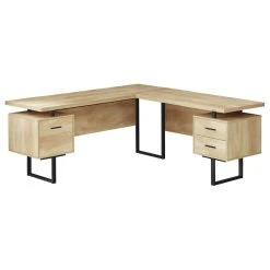 Give your home office a promotion with this extra-large, corner computer desk with 3 storage drawers. The thick-panel, L-shaped floating desktop provides plenty of room for you to spread out everything you need to be productive and allows you to use the tops of the drawer units as extra surfaces. Finished in the same natural wood-look laminate as the desktop, 2 small drawers and 1 large drawer with a bar for hanging files offer space for items you want to keep off the work surface. For flexibility, the drawer units are reversible and can be installed on either side according to your preference. Supporting the desk are metal legs in a black finish with a modern, stylish U shape.