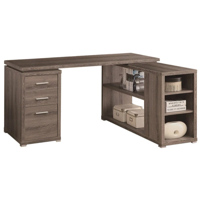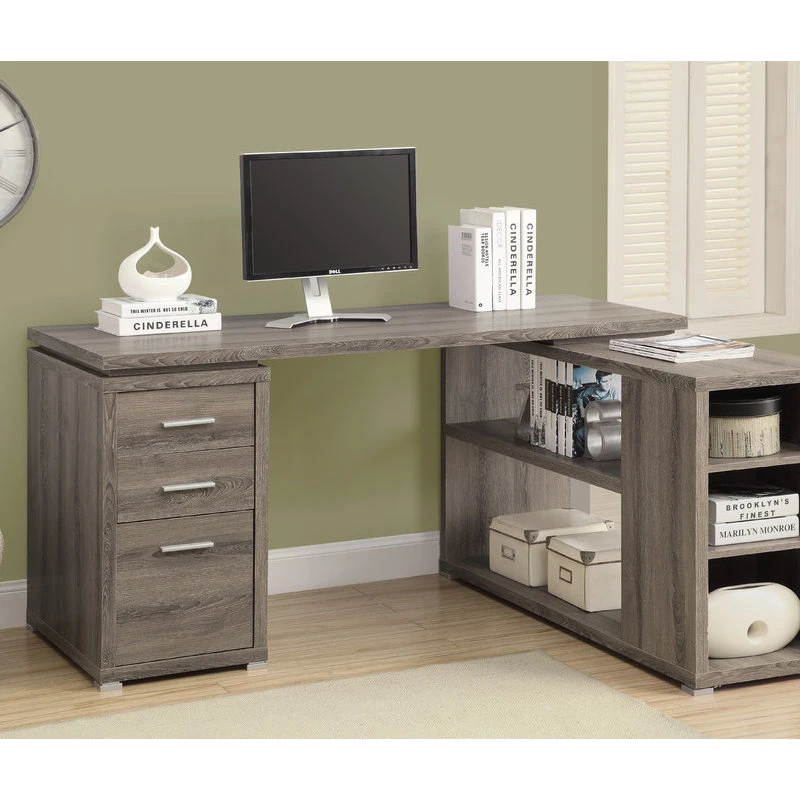 This “L” shaped computer desk will be a stunning focal point in your contemporary home office. This simple and stylish piece features thick panels and clean lines, in a dark taupe reclaimed wood-look finish. The writing desk offers a spacious work surface that is great for doing paperwork, or for using with a computer. The secondary surface offers an additional work space, and extra shelves that can be used for a printer or other important items. This piece also features two medium storage drawers and a convenient lateral file drawer below to help keep you organised. Its silver colored handles and feet boldly accent the piece making it a must-have for any home.