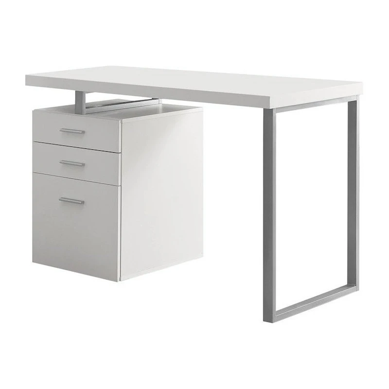 The white Left or Right Facing Computer Desk provides optimal functionality whilst enhancing your office aesthetic with a sleek, modern touch. Featuring a floating scratch-resistant laminate top and sleek track metal legs, this product boasts a storage unit comprising two normal drawers and one file drawer, which can be conveniently assembled on the left or right side. Characterized by clean lines and a streamlined aesthetic, this desk is guaranteed to blend seamlessly with an array of contemporary styes.