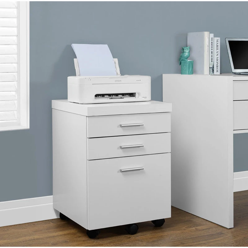 The white on castors 3-Drawer Rolling Filing Cabinet can be tucked under a desk or used to display office items. A great way to add more storage to a limited space, the 3 drawers offer ample room for stationary and other accessories. The cabinet has a reclaimed look and is finished with silver-colored drawer pulls.