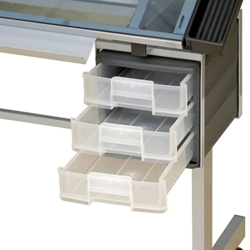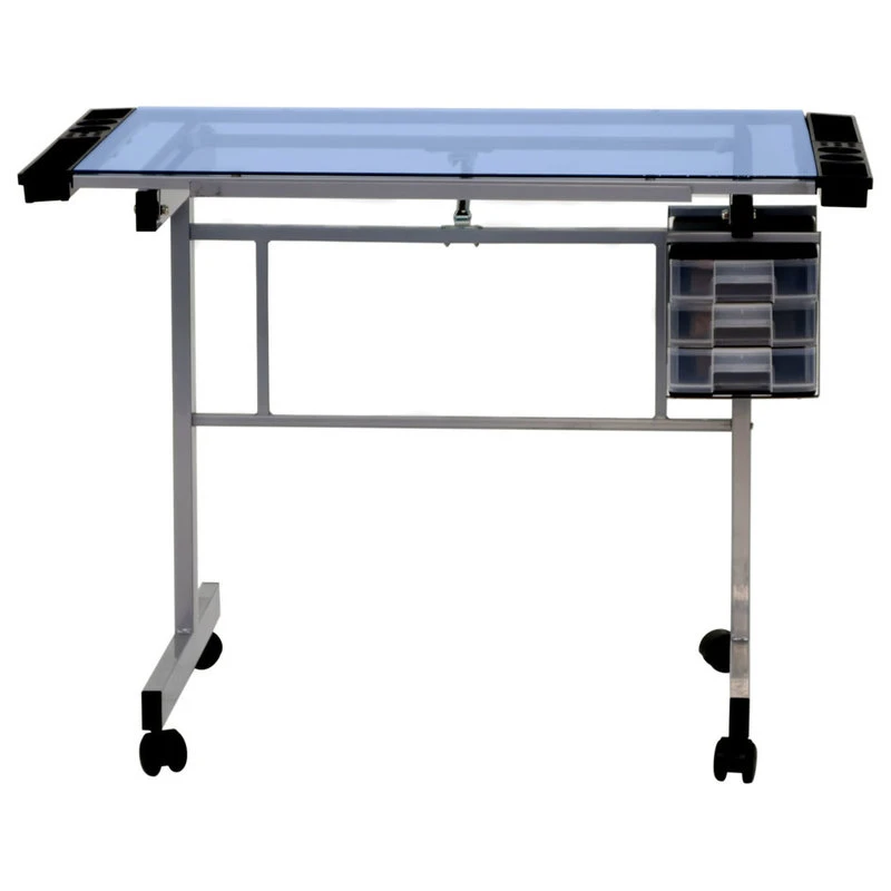 The Vision Craft Station will satisfy all of your needs as an artist or draftsman. It features a large work surface (35.5″ W x 24″ D) made of tempered blue safety glass. The angle of the table top adjusts up to 70 degrees. 3 slide-out drawers and a 2″ deep pencil ledge are built in for supplies. 4 removable side trays are included for additional storage. Wheel casters attach to the legs for mobility, two of which lock for stability. Constructed of durable heavy gage powder-coated steel.