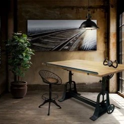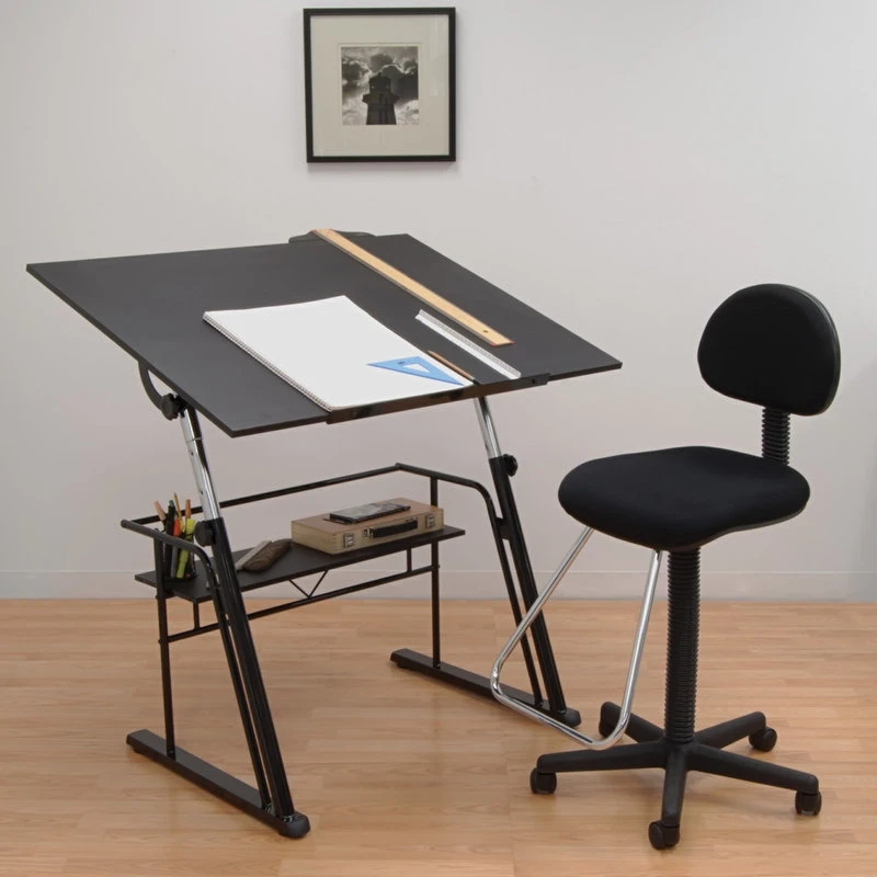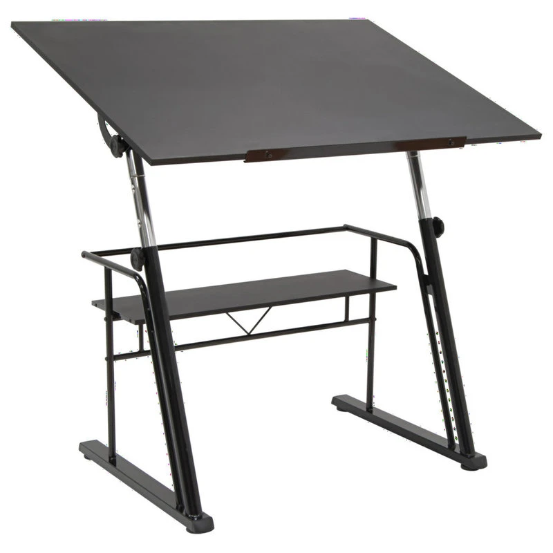 The sleek, modern design of the Zenith Drafting Table offers the versatility suitable for various projects. The main work surface features five adjustable angles, from flat to 40 degrees. The height of the table adjusts 6 inches, reaching a maximum height of 38.5″. The table also includes a 24″ pencil ledge and a spacious storage shelf below.