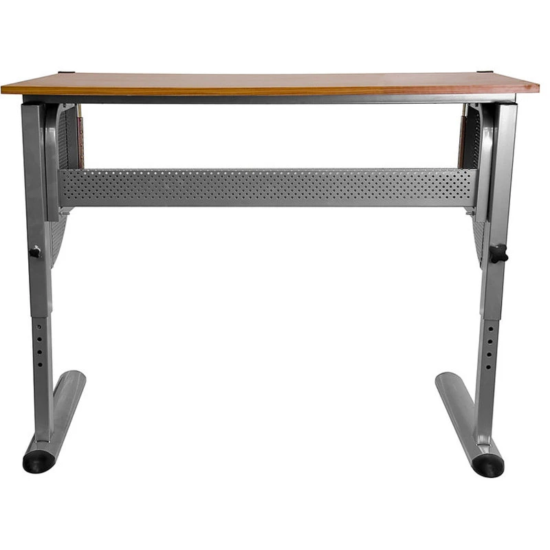 This Professional Drafting Table offers you a great looking table at an affordable price. The sleek frame finish provides a more modern appeal to fit into many environments. The work surface includes a ruler for convenient measurements when drawing out plans. Adjustable Drafting Table. .75” Melamine Laminate Work Surface. Locking Angle Adjustable Work Surface. Raised Metric Ruler Along Bottom Edge. Curved Tray holds Building Plans, Art Work or Supplies. Lower Supply Tray for Clean Surface. Height Adjustable Frame. Pewter Frame Finish.