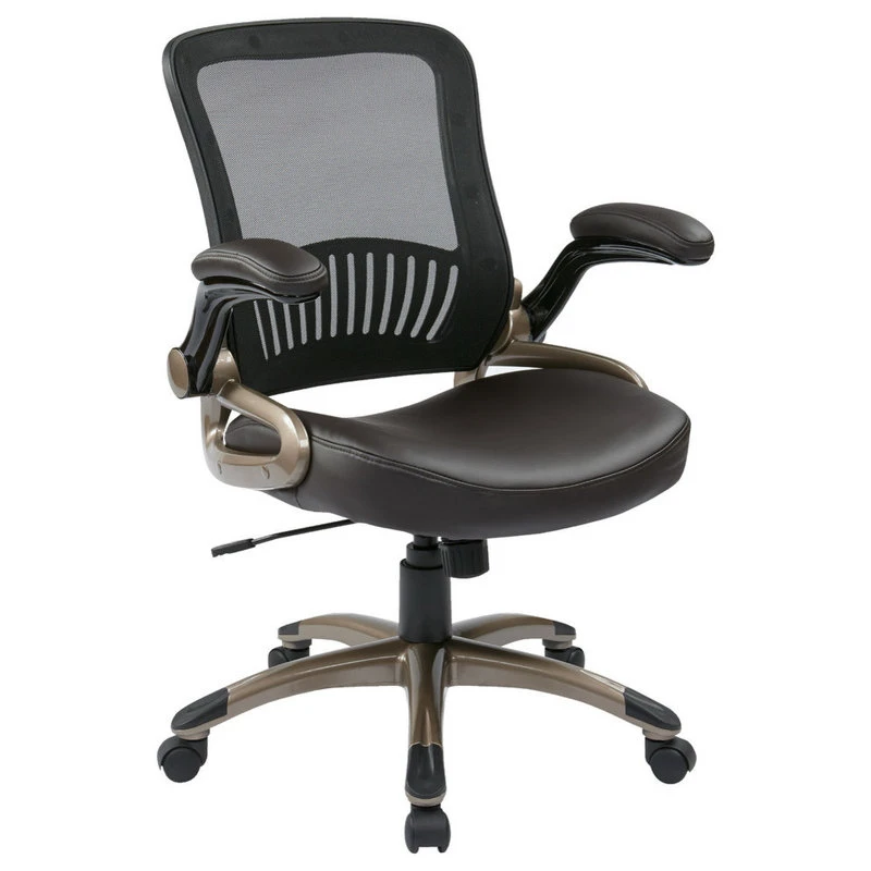 Breathable Screen Back with Built-In Lumbar Support Thick Padded Contoured Bonded Leather Seat One Touch Pneumatic Seat Height Adjustment 2-to-1 Synchro Tilt with Adjustable Tilt Tension Padded Flip Arms with Coated Accents Espresso Bonded Leather (-EC1) Heavy Duty Cocoa Finish Base with Black End Caps and Oversized Dual Wheel Carpet Casters