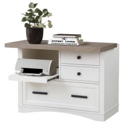Add instant function to any space with this versatile Functional File with Power Center from Americana Modern. An innovative pull-out tray gives you extra workspace any time you need it while dual AC and USB outlets prove indispensable. Finished in a soft cotton white with a contrasting wood-grain top, this home office essential is as fashionable as it is functional.