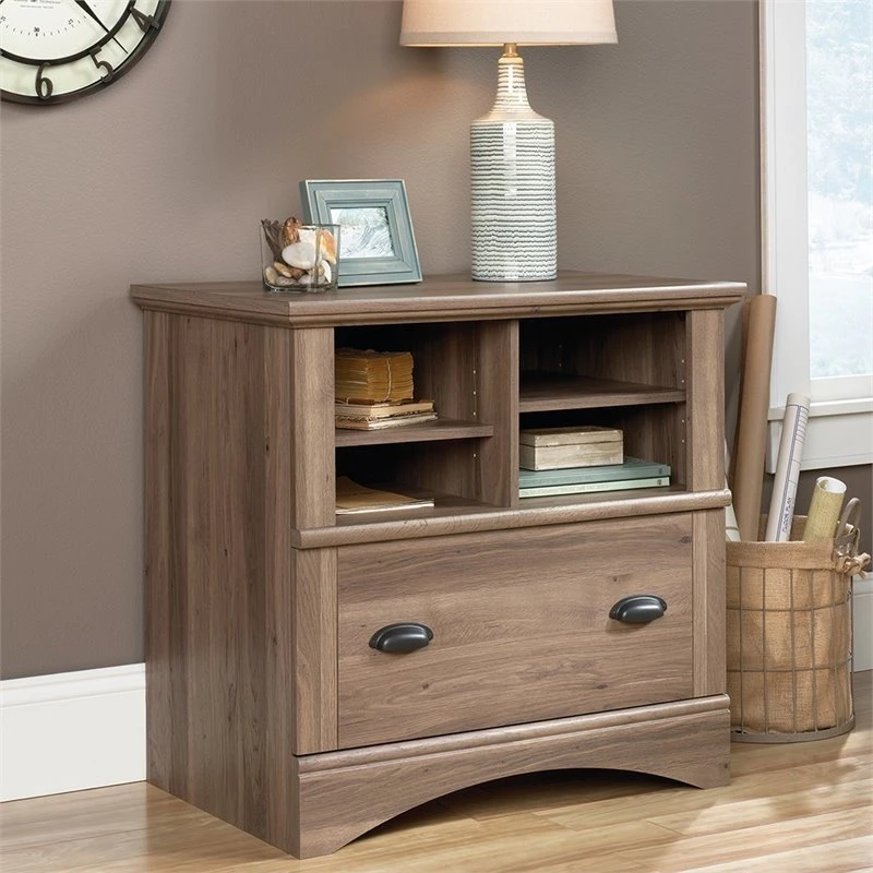 Need a solution for your clutter and chaos? Check out this lateral file from the Pemberly Row Collection. This 1-drawer lateral file cabinet features cubbyhole storage so you can stash and store your mail, important papers, or office supplies. Customize your open shelf lateral file to fit your specific needs with two adjustable shelves for a variety of display options. This single drawer file cabinet also features a file drawer with full extension slides that holds letter, legal, or European size hanging files. This file drawer has a key lock for secure storage of your most important documents. Use the top surface of this wood lateral file cabinet for displaying a lamp, photos of your family, home décor, and more. Finished in Salt Oak®, this handy legal size filing cabinet will have your home looking organized in no time. We hope you like what you see.