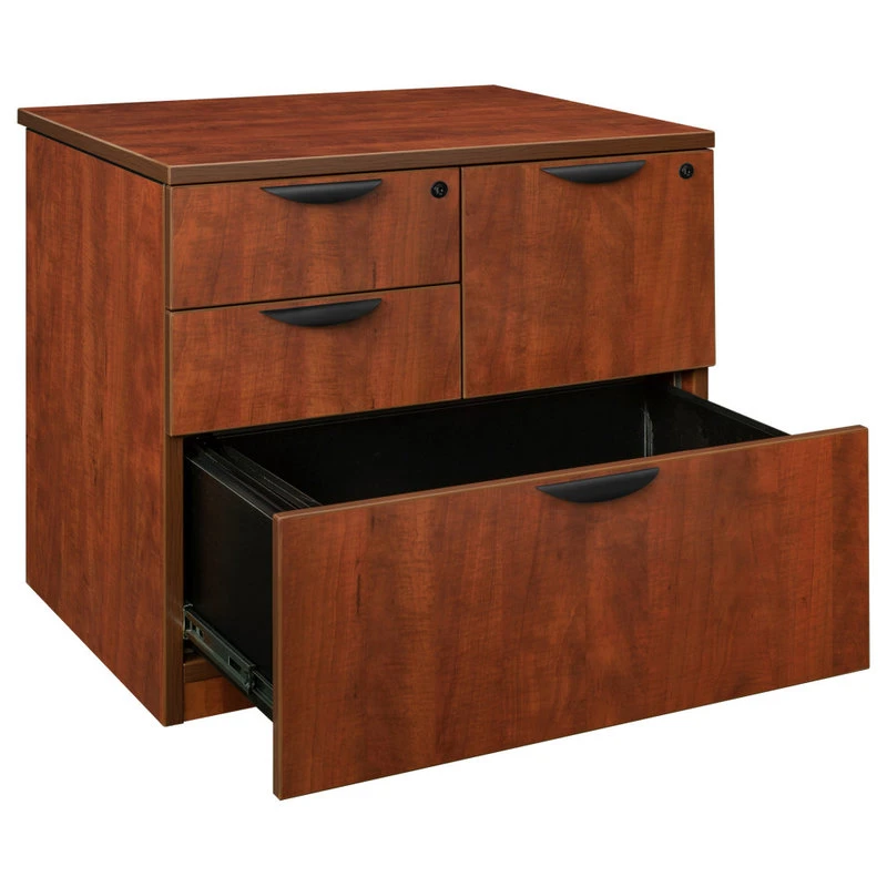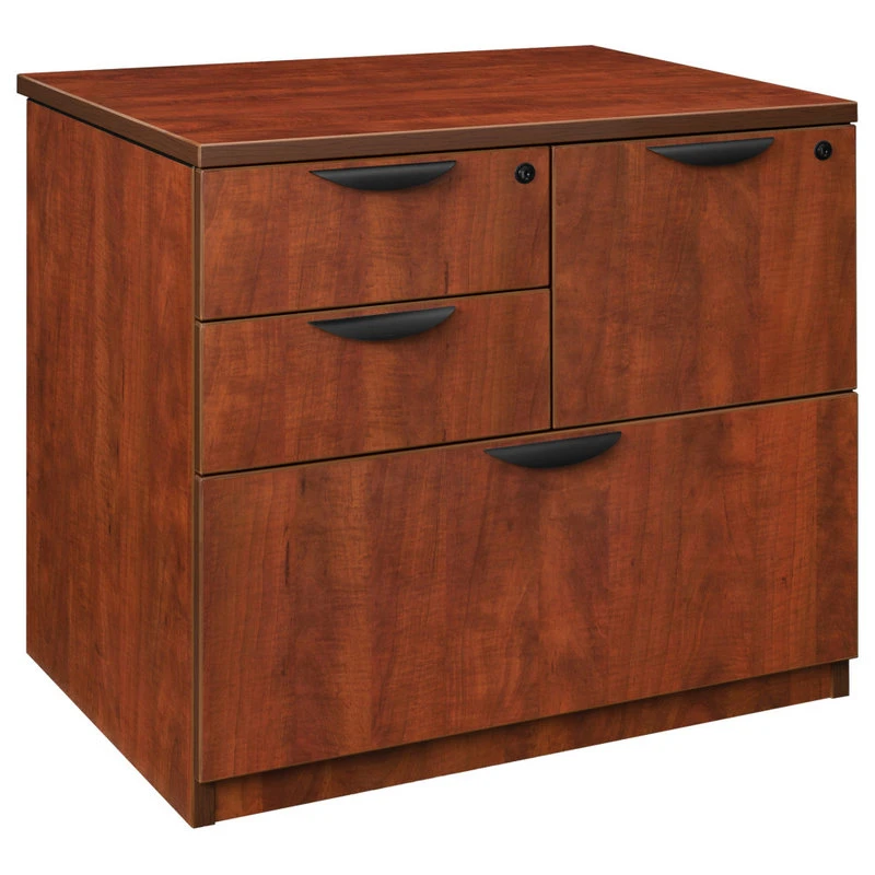 The Legacy Storage Collection offers it all from combo files and bookcases to stackable storage and laterals. This Combo File combines the best in traditional filing and it suitable in any office environment. It can be used as stand-alone storage or can be attached to Legacy desks in lieu of a traditional pedestal. It has two box drawers and one file drawer that accepts both letter and legal filing. A large full suspension lateral drawer is also included. All drawers lock and have ergonomically designed drawer pulls for convenience and ease in operation. Finished in an attractive Cherry laminate, storage components coordinate with other Legacy furniture which makes customizing easy. The Legacy collection is constructed of a 1-inch thick thermal fused melamine laminate with a 3-millimeter commercial grade matching PVC edge. Laminates are scratch, stain and scald resistant. Legacy casegoods are backed by a 10-year limited manufacturer’s warranty.