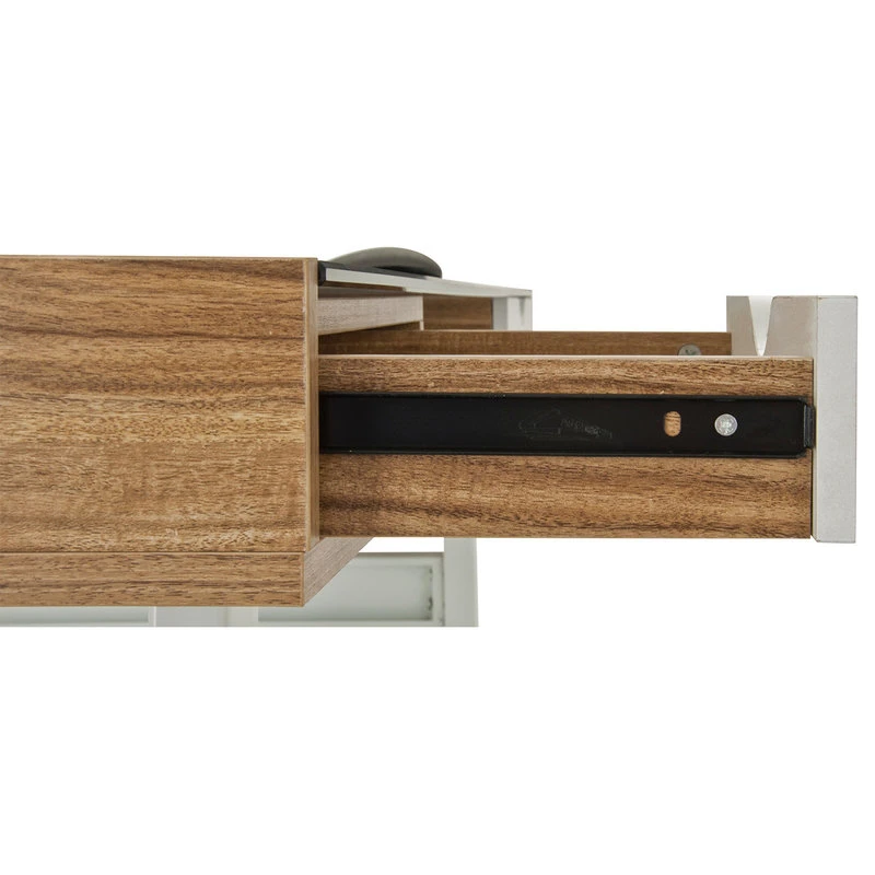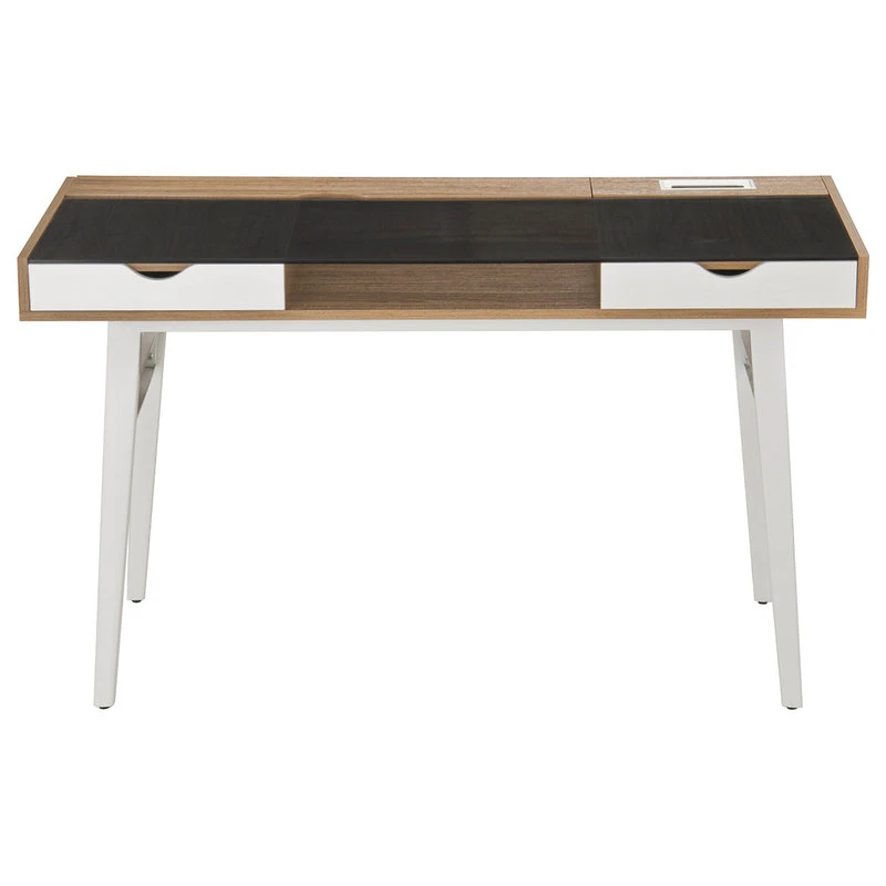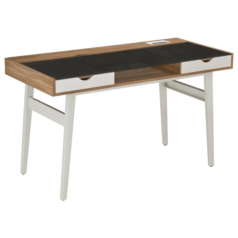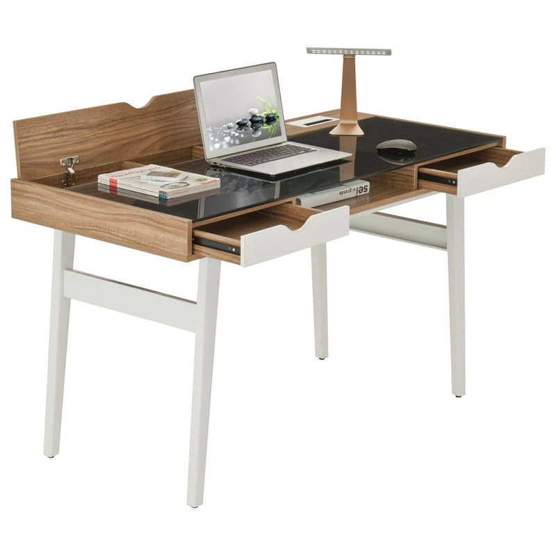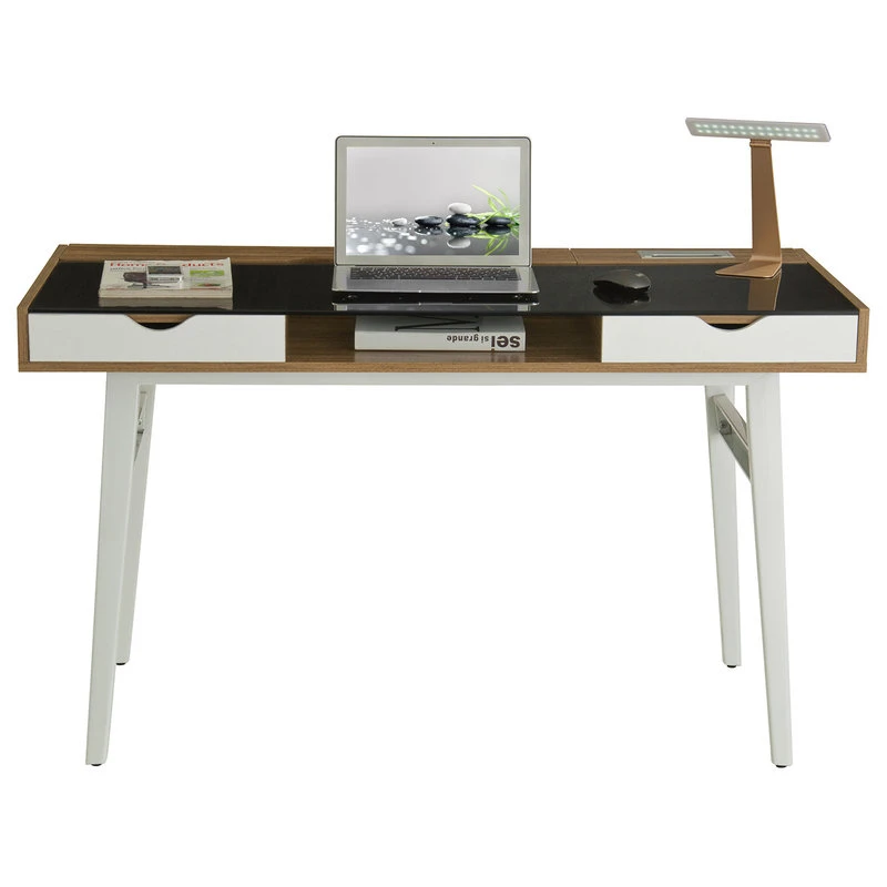 This Techni Mobili Computer desk has a stylish and unique design that compliments any modern office or room decor. It Features 2 drawers and an open shelf compartment in between, to store stationary papers, calculator and other small essentials. The spacious desktop, made of a beautiful black tinted tempered glass, can easily accommodate a computer setup, while managing it’s cables through an accessible opening back compartment. This uniquely designed desk is made of MDF wood panel with PVC veneer atop white powder coated steel frame.This modern desk is an aesthetically pleasing option and perfect for keeping cables off the floor, where they can become damaged, or create a trip hazard for foot traffic. Color: Walnut