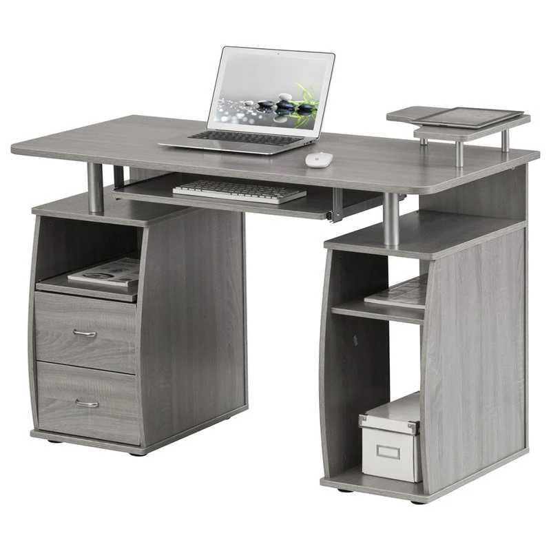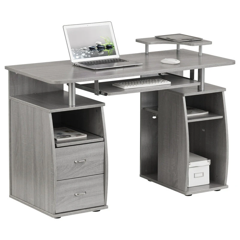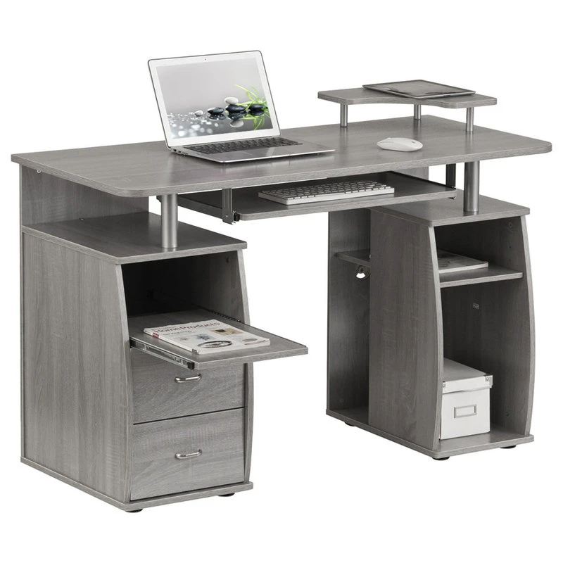 The Techni Mobili Dual Complete Computer Workstation Desk includes an elevated accessory shelf, slide-out keyboard and accessory shelves�both equipped with safety stops, 2 storage drawers, and an open CPU compartment with a shelf that can be moved up, down or completely removed. The elevated desktop provides additional storage above the pedestals. The slide-out accessory shelf and CPU compartment each have rear cable openings. The desktop has an 80 lbs. weight capacity, while the shelves can each hold up to 30 lbs., and the drawers each have a 22 lbs. weight capacity. This amazing multifunctional desk is made with MDF panels in Gray color, with a moisture laminate veneer. It’s stylish frames are made of scratch-resistant powder-coated steel, adding elegance to it’s fine design. Color: Gray