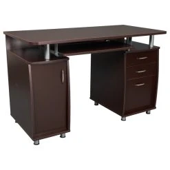 This Techni Mobili Desk is a complete workstation offering an ample work surface and plenty of storage space. It features an accessory shelf atop a storage cabinet, a keyboard panel equipped with a safety stop, 2 drawers and a file cabinet. The CPU/Storage cabinet not only has a removable shelf that can be pleased up, down or completely removed but also has a large back opening for cables. The desktop has an 80lbs weight capacity, while the shelves can each hold up to 30lbs, and the drawers each have a 22lbs weight capacity. This elegant desk is made of heavy-duty MDF panels with a moisture resistant PVC laminate veneer atop scratch-resistant powder-coated steel supports. Color: Chocolate.