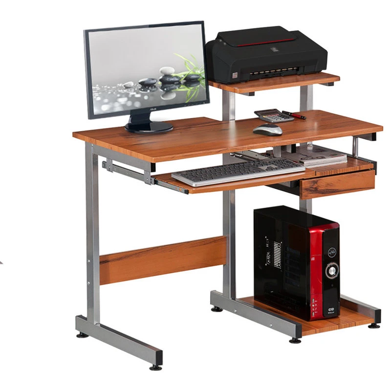 This Techni Mobili Multifunction Computer Desk saves space with its compact footprint. It has a simple yet sturdy design made of heavy-duty engineered wood panels with a moisture resistant PVC laminate veneer and a scratch-resistant powder-coated steel frame. A 10-slot media holder is mounted between the desktop and accessory shelf. The keyboard shelf and adjacent shelf and utility drawer are all mounted on slide out tracks featuring safety stops. The slide-out keyboard shelf, bottom CPU storage shelf, utility drawer, and two accessory shelves each have a 30 lb weight capacity, while the spacious desktop can hold up to 80 lbs. COLOR: Wood Grain.