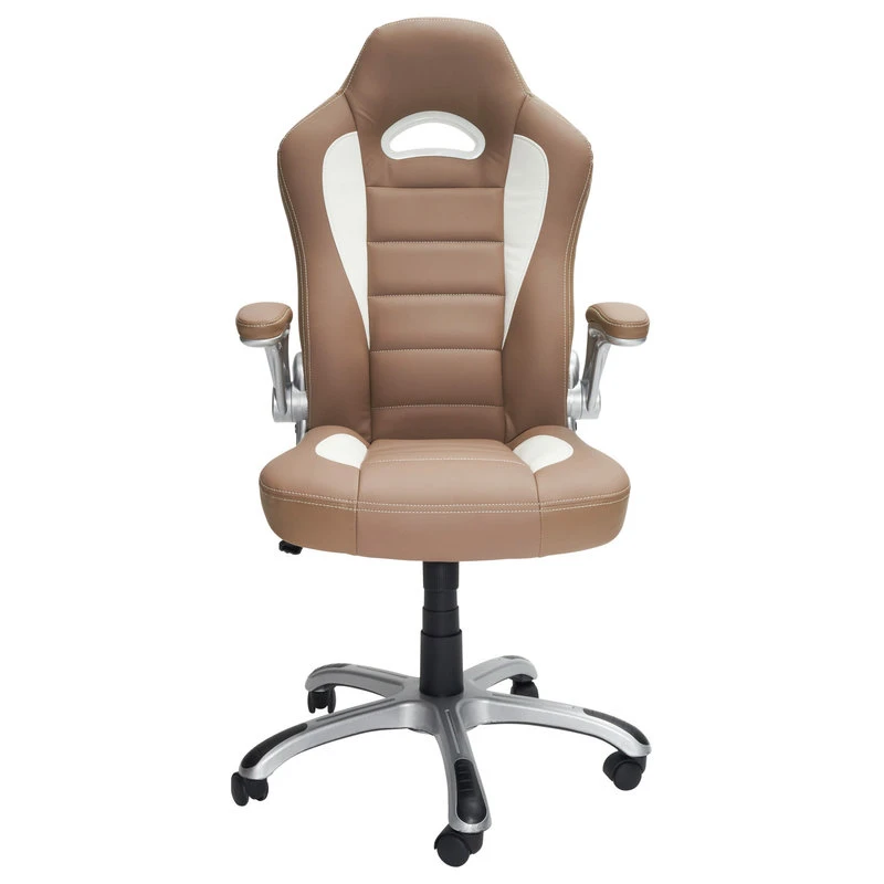 With the Techni Mobili Sport Race Executive Chair you will be the envy of the company when your co-workers, with its eye-catching Racer style with camel and white upholstery, durable silver color nylon flip-up padded arms & nylon 5 star base. This executive racer series chair comfortably fits users up to 220 lbs. This ergonomic chair will provide a comfort, durability all in a modern sleek design featuring both arms that flip up so you can push it just under the table top; this chair will make the perfect addition to spruce up your home or office space.