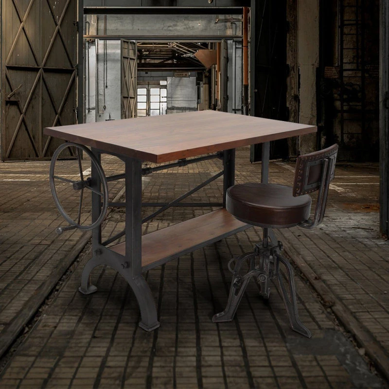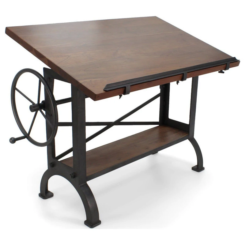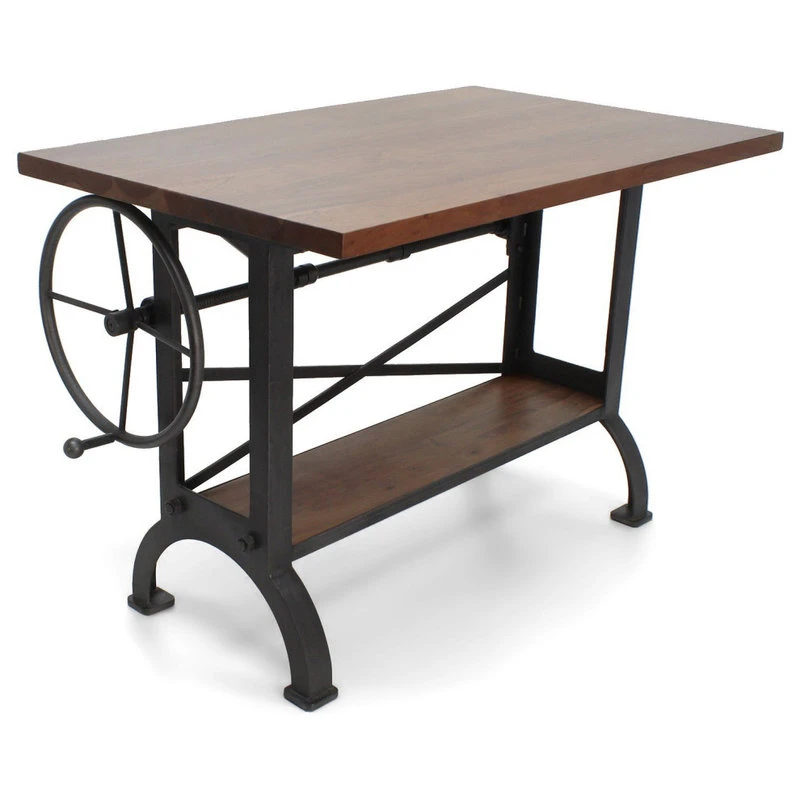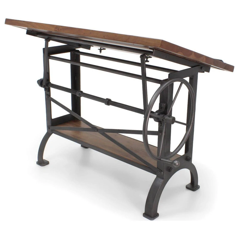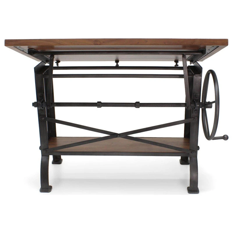 Designed by Rustic Deco and inspired by the amazing drafting tables and workbenches used by millwrights and millwork companies during the heyday of the American Industrial Revolution, cast iron and steel come together to form this clean, vintage industrial, eye-grabber. The huge hand-cranked wheel effortlessly raises and lowers the tilt-top via unique vintage-style screw-jack mechanism.