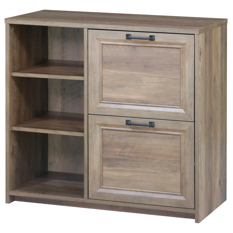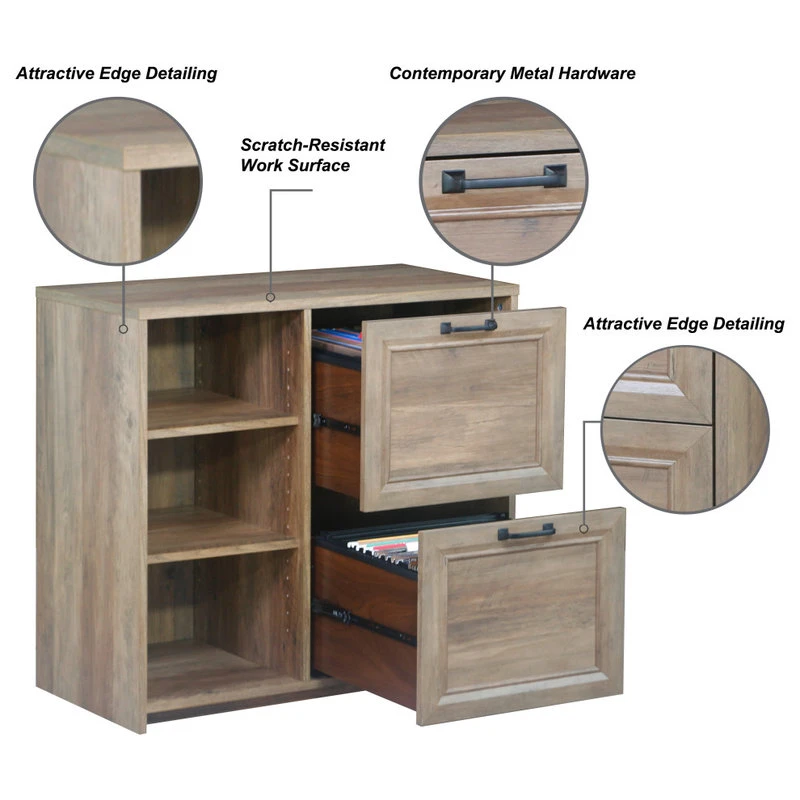 Create organization within your stylish workspace with this versatile tow-drawer file cabinet. Delivering a charming look and feel, the cabinet delivers simple hardware and a neutral finish that complements surrounding decor. The file cabinet is equipped with two file drawers great for keeping documentation close at hand. Three shelves add a spot for decor or books, allowing it to easily blend into a home office, bedroom, or living area.