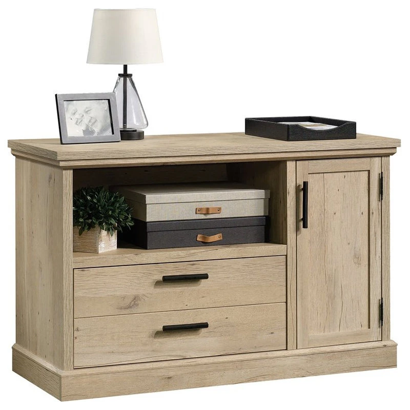 Add much needed storage space without feeling cramped in your home office with this small but functional file credenza from the Aspen Post® collection. The top of this filing credenza features a strong and lightweight 1″ panel construction – meaning, it is perfect for your heavier home office essentials while remaining easy to assemble and rearrange. This wood file cabinet features an adjustable shelf behind the door located on the right side. The adjustable shelves allow you to modify the file cabinet to accommodate items of various heights, allowing you to customize this item to your specific needs. Versatile, sleek and adjusts to your needs: What more could you ask for? Well, a file drawer of course. This single drawer file cabinet includes a file drawer with full extension slides that holds letter or legal-size hanging files. This keeps your documents organized and easy to locate. We know your time is precious, that is why this unit features quick and easy assembly with patented T-lock drawer system so your file credenza will be assembled in no time. Finished in a Prime Oak™ and featuring attractive hardware, this file credenza is the perfect addition to your home office.