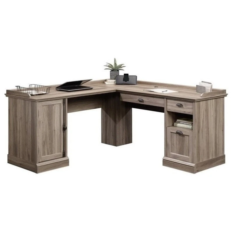 Its time for an office revamp! Do your home office a favor and give it the update it has always needed by adding the simplistic beauty of this L-shaped desk from the Barrister Lane® collection. In need of a little extra work space? Well we’ve got you covered! This L-shaped desk provides you with ample table top space for all your must-have office essentials – laptop, collection of notepads, cup of pens and even an accent lamp too! It features a large pencil drawer that opens and closes on smooth metal runners and can be fastened to either the left or right side of the desk to best fit your needs. It also features a spacious storage drawer for easy access storage of miscellaneous items like folders, your stapler, rubber bands and much more. The file drawer with full extension slides holds letter or legal size hanging files so you can keep all your important documents organized. Behind the framed panel door is a hidden storage area that includes an adjustable shelf and also accommodates a vertical CPU tower. It also features grommet holes so you can keep all your wires neat and out of the way. Finished on all sides in Salt Oak®, this stunning L-shaped desk will have you feeling motivated in the office.