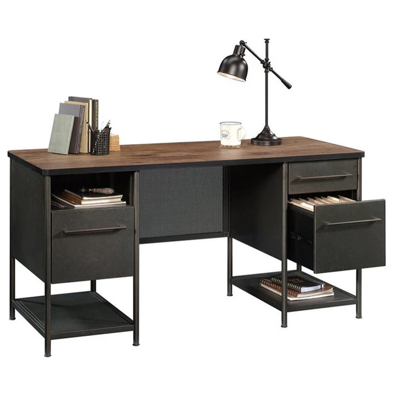 Create the wow factor in your home office or workspace with this industrial-inspired executive desk from the Boulevard Cafe collection. Its spacious tabletop provides yours with room for your laptop, folders, stationery, and all other office essentials – that includes your coffee mug. It features three drawers with full extension slides that open and close on smooth metal runners. Meet all your filing needs with the two lower drawers that accommodate letter-size hanging files. For additional storage, it also includes a cubbyhole along with two lower open shelves for easy access storage of books and papers. It is constructed from a durable, powder-coated metal frame and is accented with perforated metal panels to add an extra splash of unique style to this already beautiful office desk. Finished on all sides in black with a vintage oak accent, this visually stunning desk gives your office an exclusive look and will have you feeling like a top executive.