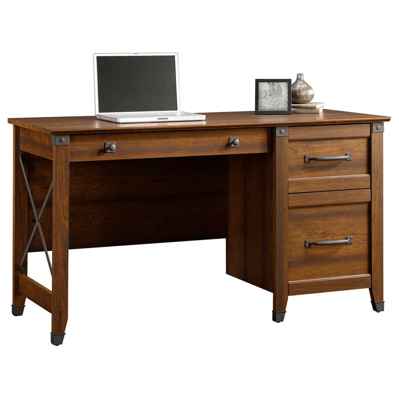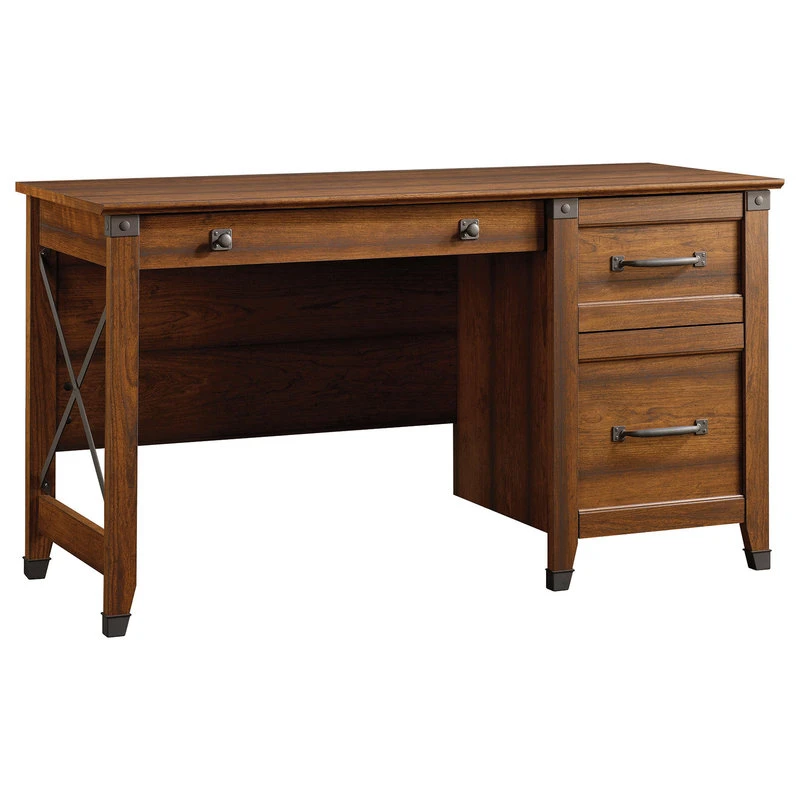Whether you’re looking for a place to get some work done or really just need another surface for your colossal penny collection, this desk from the Carson Forge® collection is perfect for you. This home office desk features three drawers that glide on smooth metal runners – each provides versatile storage for pens, pencils, notebooks, binders and more. The lower drawer holds letter-size hanging files to help keep your most important files organized and easy to find. The spacious top surface of this desk with storage is large enough for a computer, lamp, your planner, and more. Finished in a rustic Washington Cherry and accented with wrought iron style hardware, this desk hard is to take your eyes off of. We hope you like what you see. Sauder designers travel the world and bring back the best and latest in style, finish, and color trends. This inspiring world travel is evident in the cutting edge and innovative furniture solutions we offer to you!