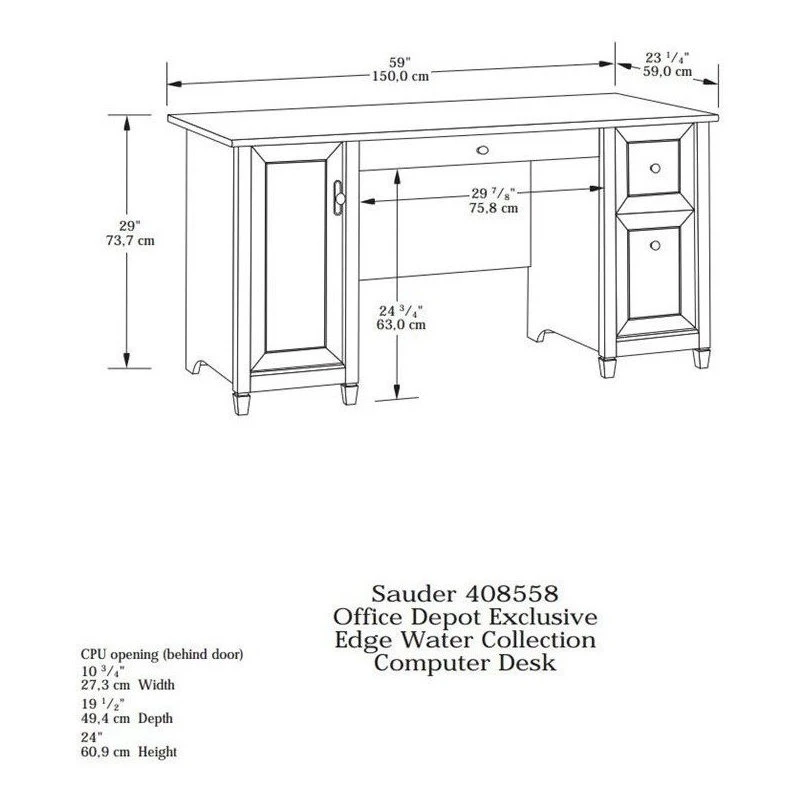 Work in style! Add some classic beauty to your office with this computer desk from the Edge Water® collection. It has a spacious tabletop with an ample amount of room for all your office essentials – laptop, paper, and of course your favorite coffee cup. This home office desk features a flip-down molding that reveals a slide-out keyboard/mouse shelf that includes metal runners and safety stops. This desk with storage also features two large drawers that open and close on smooth metal runners for easy access storage of miscellaneous office items. The lower drawer holds letter or European size hanging files so you can keep all your important documents organized. Behind the door is a hidden storage area that includes an adjustable shelf and accommodates a vertical CPU tower for a clutter free top surface space. Finished in Estate Black® with solid wood accents, this desk with file drawer is just what your office has been looking for.