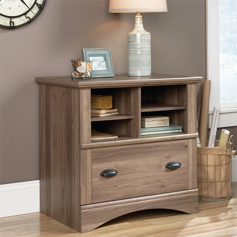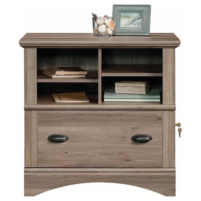 Need a solution for your clutter and chaos? Check out this lateral file from the Harbor View® collection. This 1-drawer lateral file cabinet features cubbyhole storage so you can stash and store your mail, important papers, or office supplies. Customize your open shelf lateral file to fit your specific needs with two adjustable shelves for a variety of display options. This single drawer file cabinet also features a file drawer with full extension slides that holds letter, legal, or European size hanging files. This file drawer has a key lock for secure storage of your most important documents. Use the top surface of this wood lateral file cabinet for displaying a lamp, photos of your family, home décor, and more. Finished in Salt Oak®, this handy legal size filing cabinet will have your home looking organized in no time. We hope you like what you see. Sauder designers travel the world and bring back the best and latest in style, finish, and color trends. This inspiring world travel is evident in the cutting edge and innovative furniture solutions we offer to you!