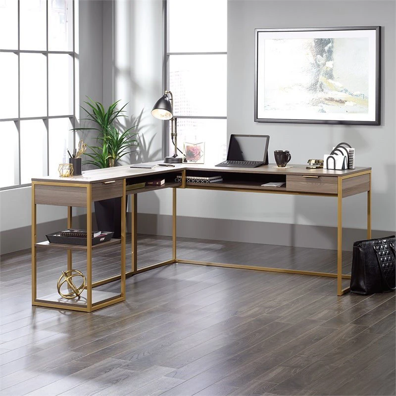 Your home office is allowed to be stylish too. Dress up your office space when you add the sophisticated style and modern design of this L-shaped desk from International Lux collection. Its spacious top surface provides you with all the room you need for your must-have desk essentials like your laptop, stacks of notepads, your array of pens and of course your coffee mug too. It features two storage drawers that open and close on smooth metal runners for easy access storage of miscellaneous items likes loose papers and folders. It also features open shelving with a fixed shelf and cubbyhole storage options for all your other office necessities. The desktop features grommet holes so you can keep your cords organized and out of the way. Its finished on all sides for versatile placement throughout your home. Finished in diamond ash and detailed with a gold, powder coated metal frame, this handsome desk is just what your office needs.