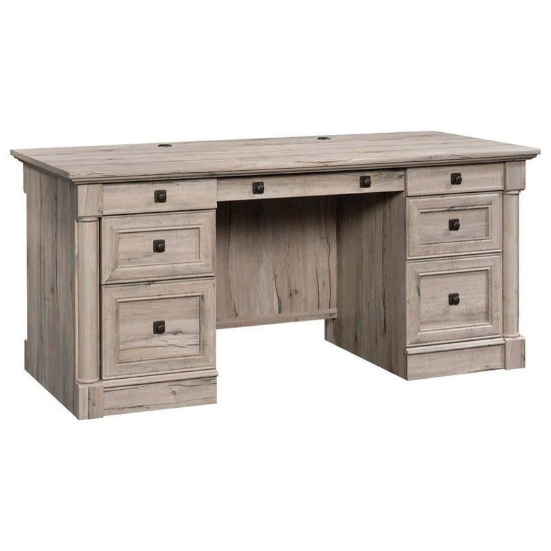 It’s time for your inner boss to shine! Create a one-of-a-kind work environment with the beautiful style and design of this executive desk from the Palladia collection. This home office desk offers a spacious top surface that provides you with the room you need for all your desk essentials like your laptop, stacks of notepads, and your hot cup of coffee. It also has space for items like an accent lamp and picture frames. This computer desk features a large drawer/shelf that features a flip-down panel for your keyboard, mouse, or laptop. This office executive desk also features two pencil drawers and two storage drawers that open and close on smooth metal runners for convenient use. The lower drawer with full extension slides accommodates letter, legal, or European size hanging files to help keep you organized. Keep cords and wires organized. This executive desk includes two desk top grommets and numerous pass-throughs. Finished in Split Oak and detailed with attractive hardware, this computer desk with storage will have you feeling motivated and ready to work!