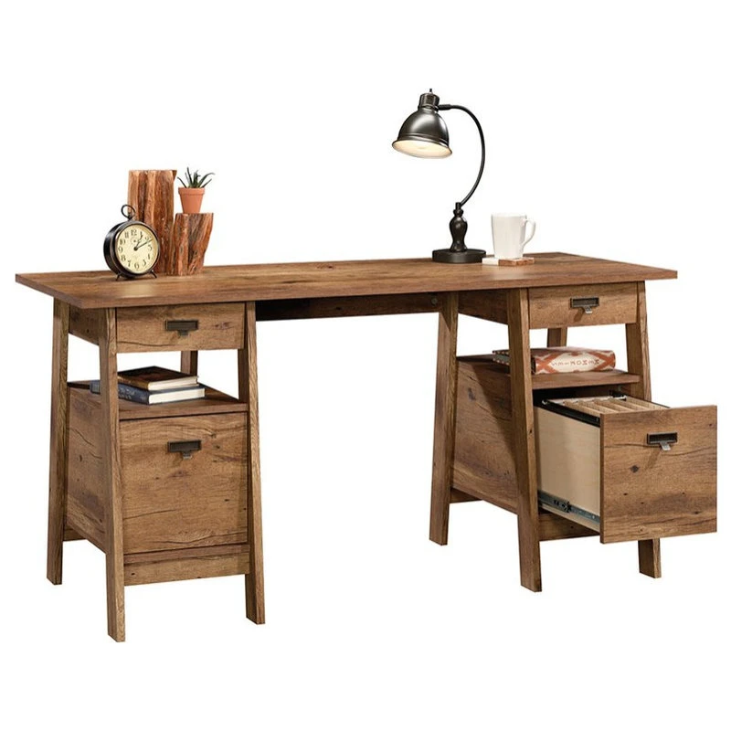 Whether it’s writing out your grocery list or working on your next big project, this writing desk from the Trestle collection is just what you need. This home office desk offers a spacious top surface that provides you with all the room you need for your must-have desk essentials like your laptop, a cup full of pens, stacks of notepads and your favorite coffee mug. You can even find space for home décor items like an accent lamp and picture frames too! This writing desk features two small drawers that open and close on smooth metal runners for easy access storage of supplies. It also includes two file drawers with full extension slides to hold letter-size hanging files. Other features include a grommet hole for cord access so you can keep all your wires neat and out of the way. Finished on all sides in vintage oak, this beautiful executive desk will have you feeling motivated and ready to work.