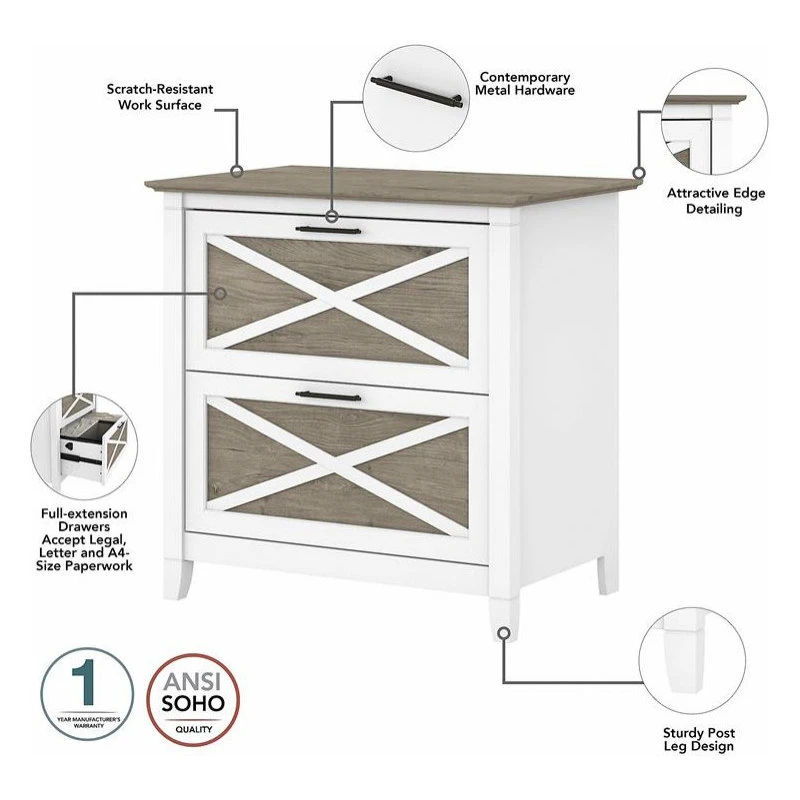 A natural fit for homes that embrace coastal and farmhouse decor, the Scranton & Co Furniture Key West 2 Drawer Lateral File Cabinet is perfect for organizing paperwork in virtually any room. Two file drawers open on smooth full-extension ball bearing slides for an easy reach to legal and letter size documents. A unique X pattern accent on the drawer panels creates a relaxed style supported by a sturdy and attractive post leg design. This 30W x 20D x 30H lateral filing cabinet matches the height of any Key West Desk (sold separately) to create an extended work surface when placed side by side. The Key West Collection offers a wide variety of farmhouse furniture that makes building a complete home office or living room a breeze. This 2 drawer filing cabinet is tested to meet ANSI/SOHO quality standards for safety and performance and is backed by the Scranton & Co Furniture 1 Year Manufacturer’s Warranty.