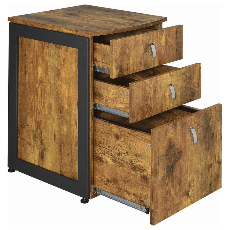 This handsome file cabinet will keep your office organized in minimalist style. With a warm antique finish of antique nutmeg, it exudes old-world charm. Its metal drawer hardware boasts a gleaming chrome finish, adding a modern edge to its classic aesthetic. Complete with three convenient drawers, it includes a handy file cabinet that safely stores letter-size files.