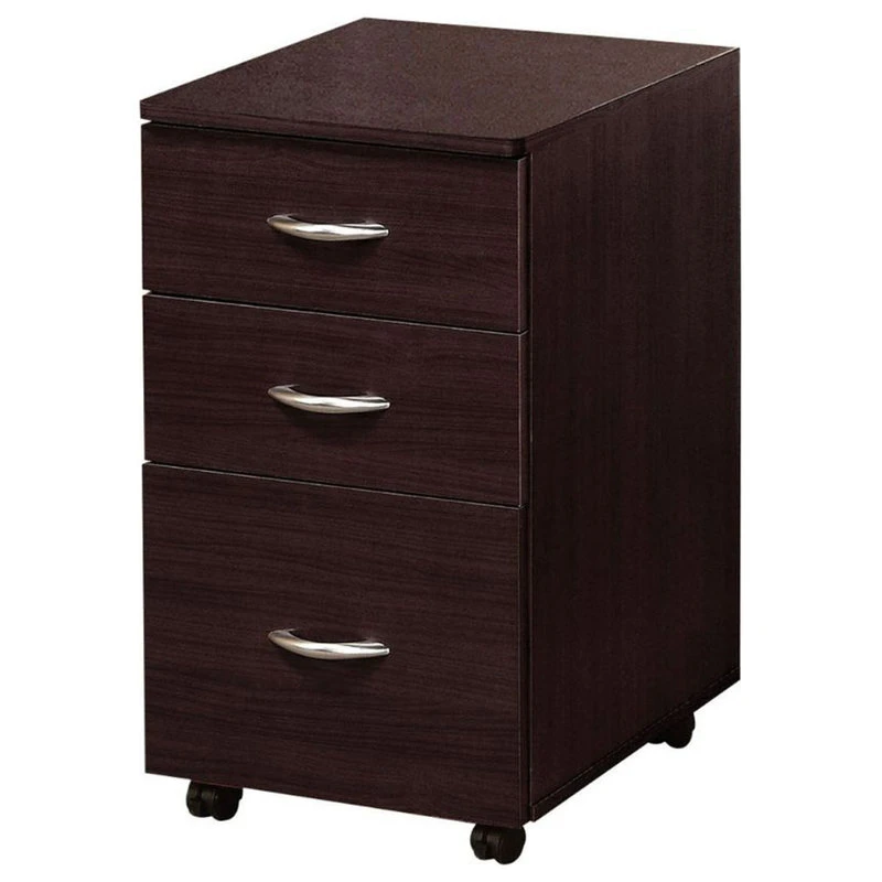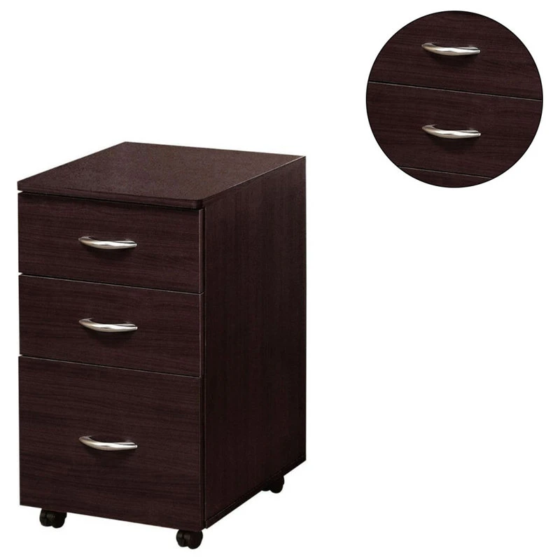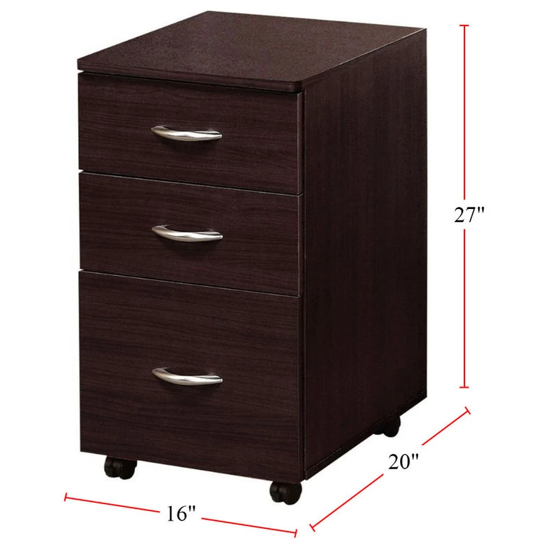 This storage file cabinet in espresso fnish features two storage drawers and a file drawer. This simple design item with casters for easy mobility will be essential part of your home office. Also available in espresso. Assembly required. Metal rails are not included.