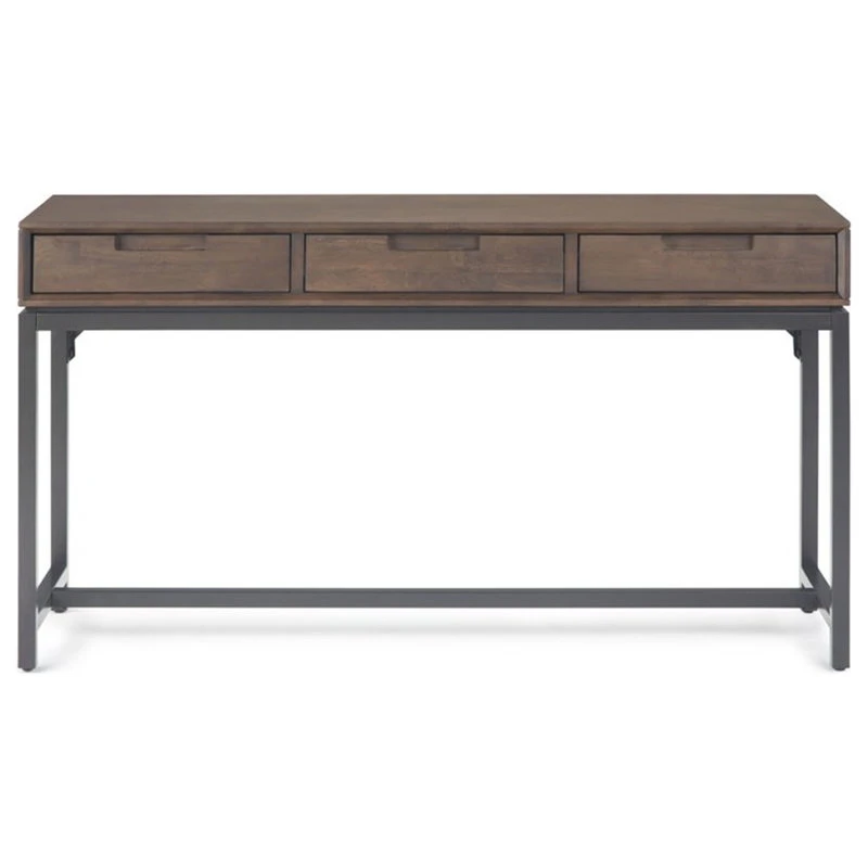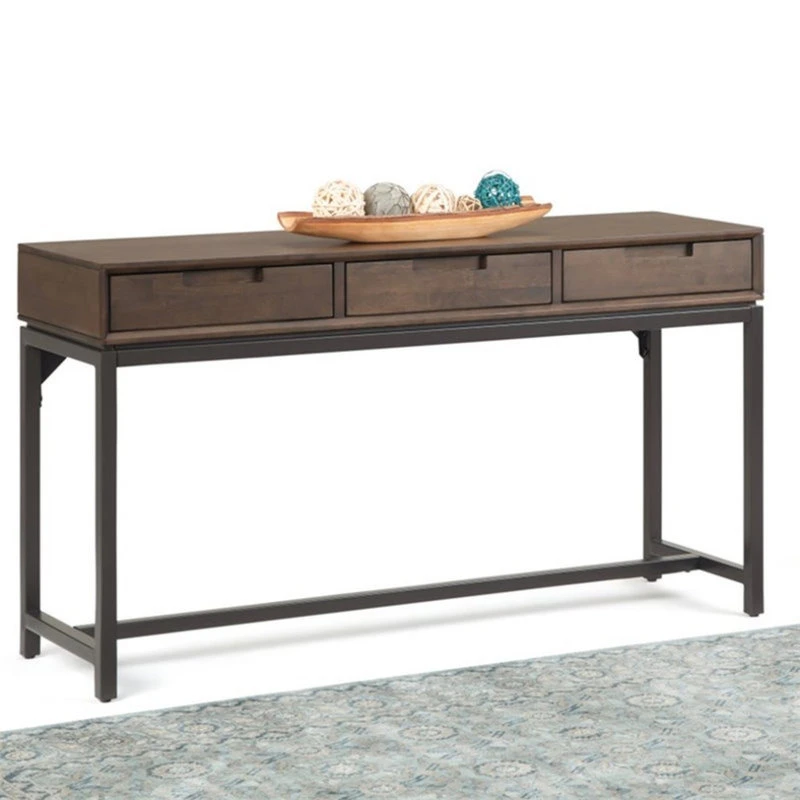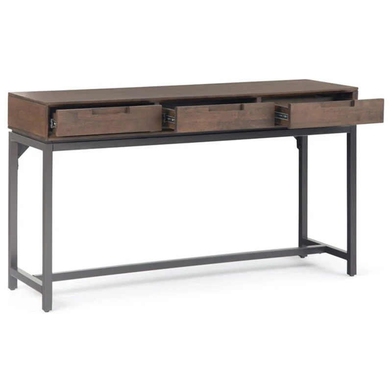 The Banting Collection is made from richly-grained solid Rubberwood. This mid-century modern industrial collection has a clean angular metal base, with square, simple modern drawer and table top. With no visible hardware, and only simple wood pull handles, the solid Rubberwood top, is simple and uncomplex. The Banting 54 inch Wide Console Table has three working drawers with full extension ball bearing drawer glides to maximize functionality. The 16″ x 54″ size is extra large to fit perfectly behind your sofa so that you can display all of your treasures. Functional and elegant this console table can fit almost anywhere The Banting collection includes coffee, console, end tables, tv stands, sideboard buffet, desks and bookcase.