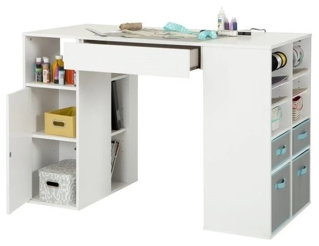 One module has ten open compartments separated by eight adjustable divisions, so you can place them at an angle if you wish. You’ll also find two ribbon holders in the top spaces. In addition to these compartments, you get a drawer in the center and two spaces separated by a removable shelf behind the cabinet door. In the other module, five compartments of varying sizes are accessible from different angles and there is a small bin for storing rolls. Your art material will finally be well organized! This South Shore Modern Wood Crea Storage Counter Height Craft Table in White will undoubtedly be a great addition to your home décor.