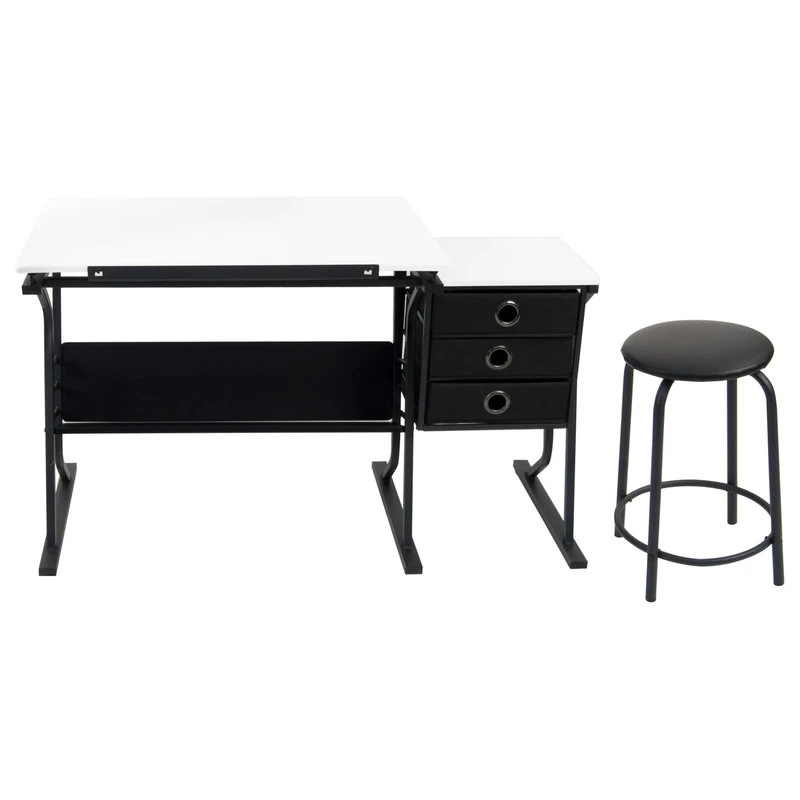 This 3-piece Center by Studio Designs provides a comfortable work space and keeps your supplies easily accessible. The table top is adjustable up to 40 degrees and includes a 24pencil ledge that slides up and locks into place when needed. The set also features three adjacent storage drawers and a padded stool. The durable heavy gage steel construction includes six floor levelers for stability. Main work surface: 35.5W x 23.5D. Overall dimension: 49W x 24D x 30H