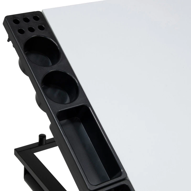 The Folding Craft Station by Studio Designs suits a variety of artists’ needs. Easy to manage, this table assembles without tools in five minutes or less and folds flat for easy storage. The table top adjusts to 6 different angles ranging from 0 to 35 degrees. Its frame is built of heavy gage steel for durability. 4 removable side trays are available for supplies. A 24” pencil ledge slides up and locks into place when needed. The Silver/Blue Glass table option features a tempered safety glass top and can be used with light pads or light boxes as a Light Table for tracing (Light Pad Support Bars #10049 may be purchased separately). Floor levelers on each leg add stability. Available in Silver/Blue Glass, Black/White. Main work surface: 35.25″W x 23.75″D. Overall dimensions: 40.75”W x 23.75”D x 30.75″ -44.25″”H.