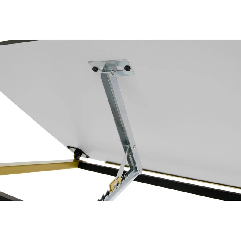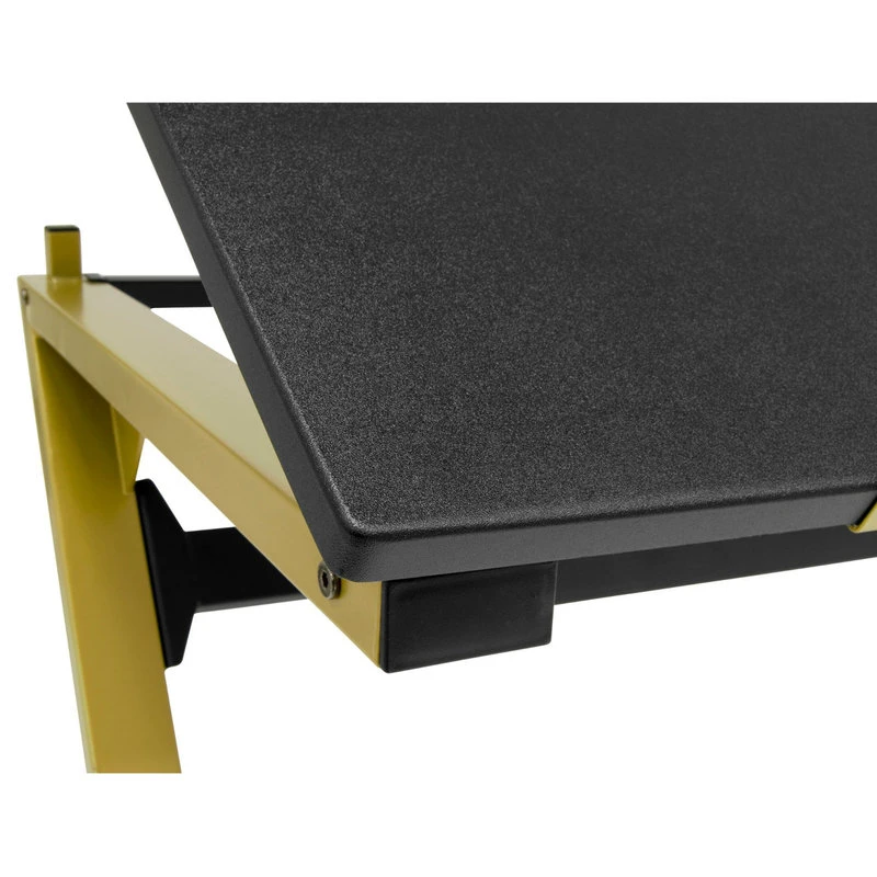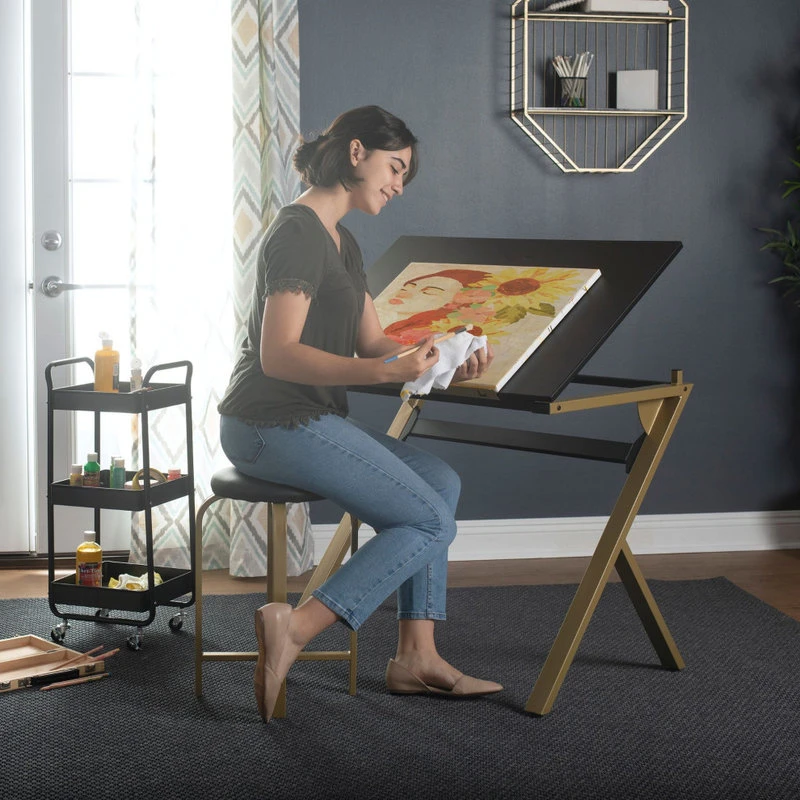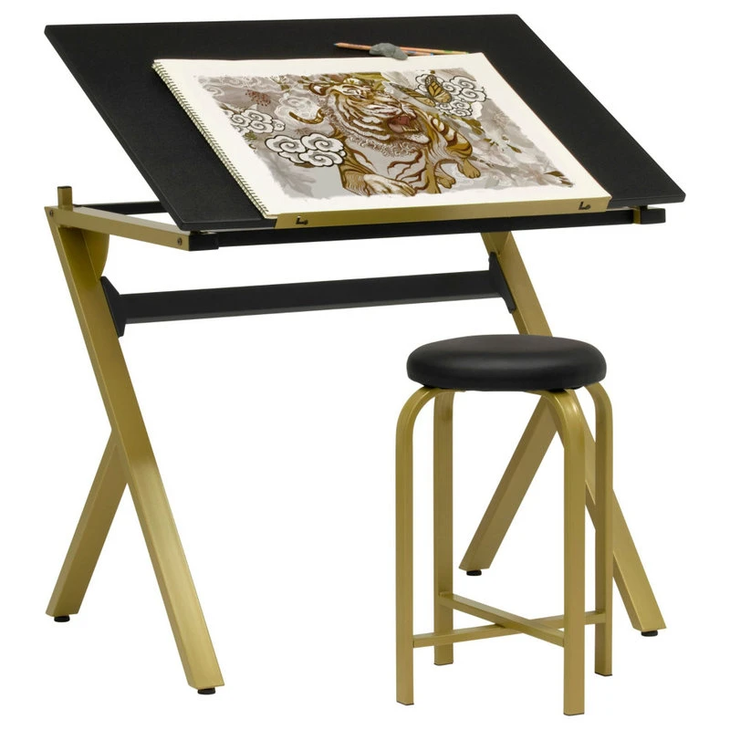 The Stellar 36-inch Wide Drawing Table with Padded Stool Set by Studio Designs is a simple, modern design and offers an affordable solution for those new artists looking for an art studio workstation. Like other drafting tables, the top adjusts from flat to a 40-degree angle to alleviate neck pain. The 24″-wide pencil ledge keeps your pencils and markers from falling while the tabletop is tilted. The durable black desktop offers plenty of space for your projects. The attractive gold powder-coated steel frame is unique and offers a stylish option for your home. The stool fits under the table making it perfect for small spaces. This simple table can easily be upgraded by adding an art supply storage tray or a clamp lamp, also available from Studio Designs, to complete your drawing center. Keep it simple, or customize it, either way, this drafting table and chair set provide a stylish option for your drawing needs.