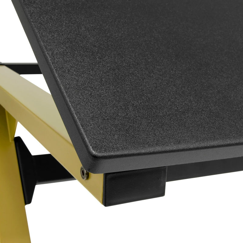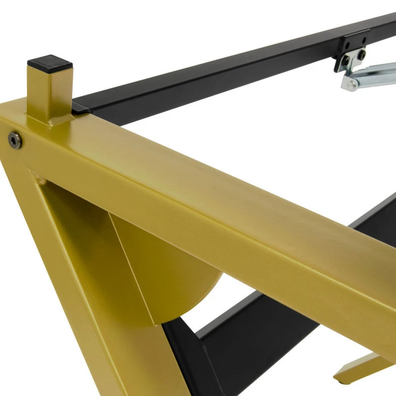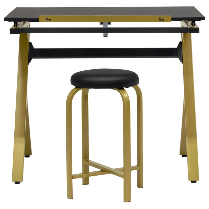 The Stellar 36-inch Wide Drawing Table with Padded Stool Set by Studio Designs is a simple, modern design and offers an affordable solution for those new artists looking for an art studio workstation. Like other drafting tables, the top adjusts from flat to a 40-degree angle to alleviate neck pain. The 24″-wide pencil ledge keeps your pencils and markers from falling while the tabletop is tilted. The durable black desktop offers plenty of space for your projects. The attractive gold powder-coated steel frame is unique and offers a stylish option for your home. The stool fits under the table making it perfect for small spaces. This simple table can easily be upgraded by adding an art supply storage tray or a clamp lamp, also available from Studio Designs, to complete your drawing center. Keep it simple, or customize it, either way, this drafting table and chair set provide a stylish option for your drawing needs.