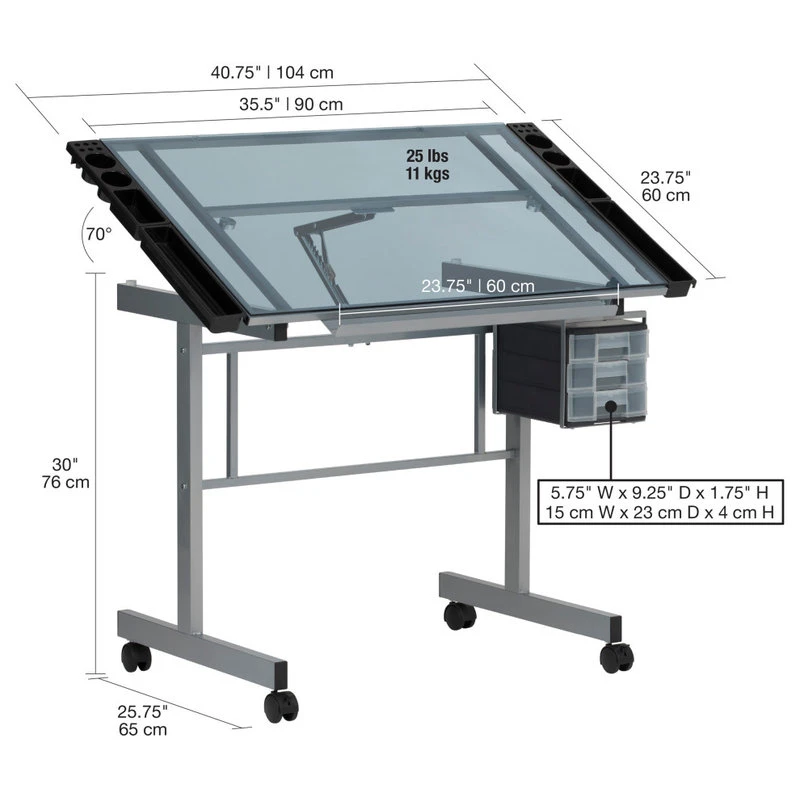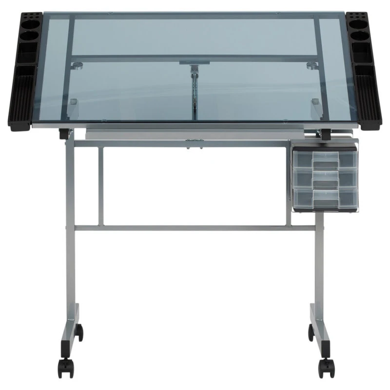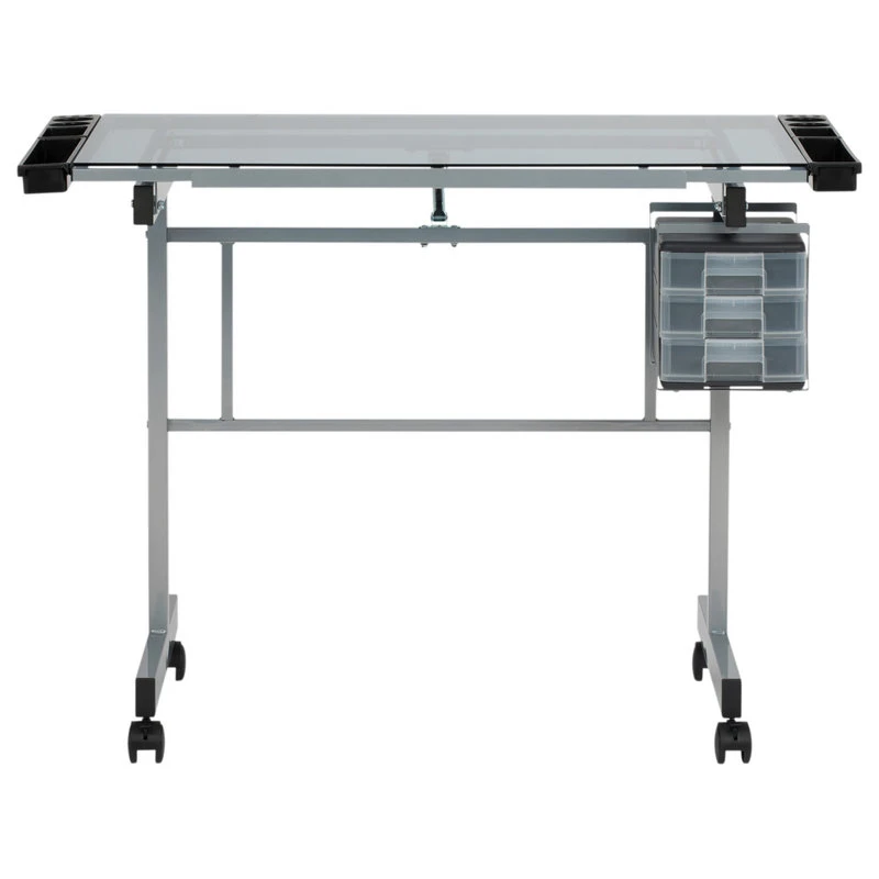 The Vision Craft Station will satisfy all of your needs as an artist or draftsman. It features a large work surface (35.5″ W x 24″ D) made of tempered blue safety glass. The angle of the table top adjusts up to 70 degrees. 3 slide-out drawers and a 2″ deep pencil ledge are built in for supplies. 4 removable side trays are included for additional storage. Wheel casters attach to the legs for mobility, two of which lock for stability. Constructed of durable heavy gage powder-coated steel. In Silver/Blue Glass. Overall Dimensions: 40.75″ W x 26″ D x 30″ – 49″ H