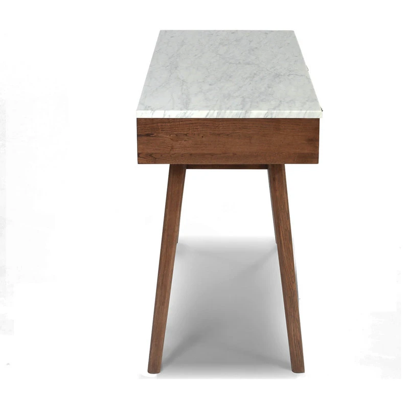Versatile for many functions and rooms, this writing desk can be used as a laptop workspace, large console table, or vanity. Its compact shape easily accents a living room, bedroom, study, entryway, home office, or kitchen. Two wide drawers provide storage to hide away your accessories and clutter. The desk base and legs come in four different neutral wood finishes paired with a classy white and grey marble to elevate and add style to any space.