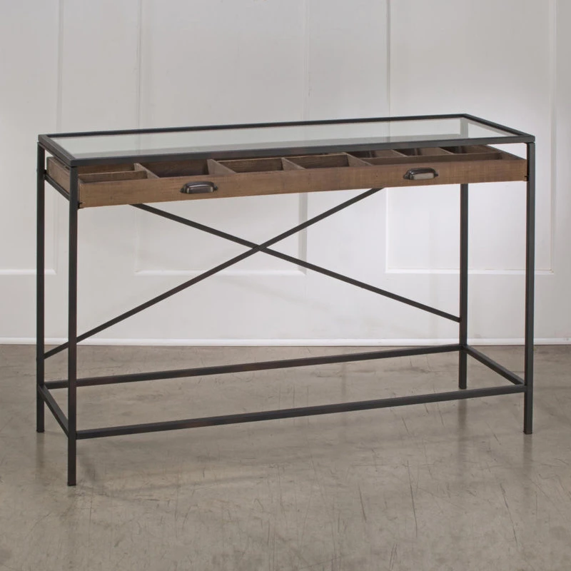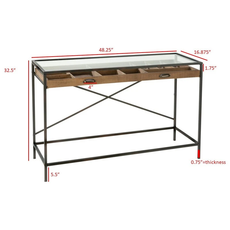This Console Table features a functional storage drawer divided into fixed compartments for organized storage and protection under a glass top. Looks stunning with any decor! Use it in a foyer or family room to display keepsakes or in a closet to showcase ties, socks, and jewelry and more. Feature other accessories on the glass top. Perfect piece of furniture for organization and fashion. Assembly is easy but two people recommended for glass placement.